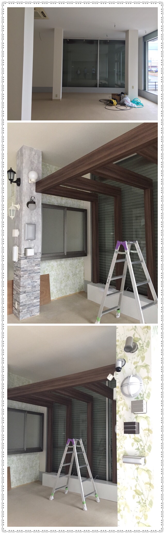 写真、位置がちょっとずれてますが。何にもなかった空間に柱と梁を作ってみました。