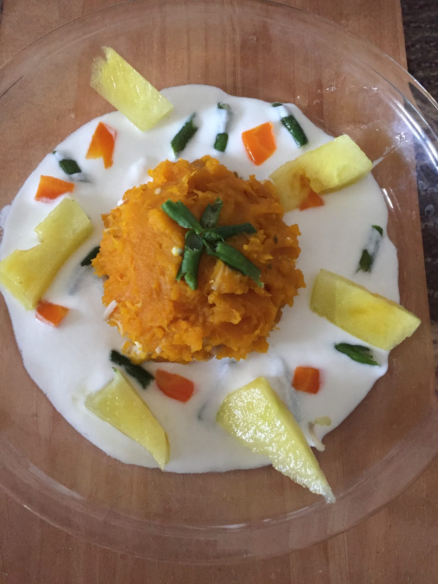 朝ごはんは 鶏肉をかぼちゃペーストで覆ったケーキ。