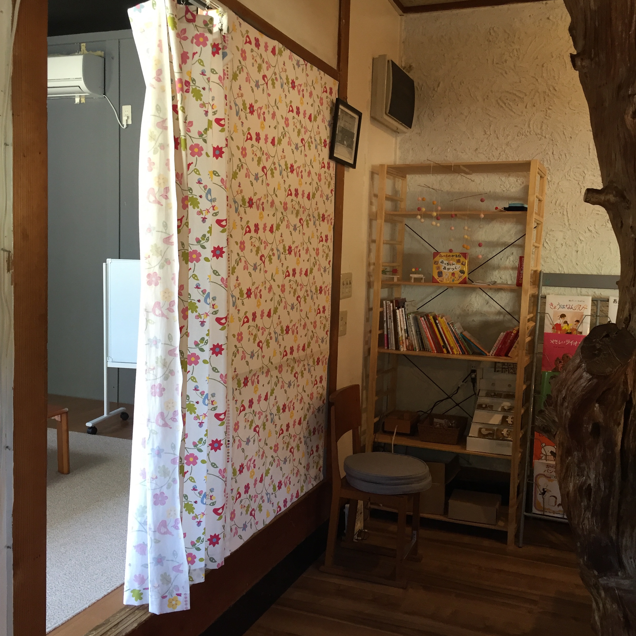 元々は和風の内装なので、それを隠すのにカーテン生地をのれんのように。