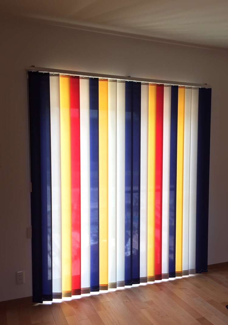 ストライプのカーテンだと2色、これだとたくさん色が使える、ということでこちらを採用。