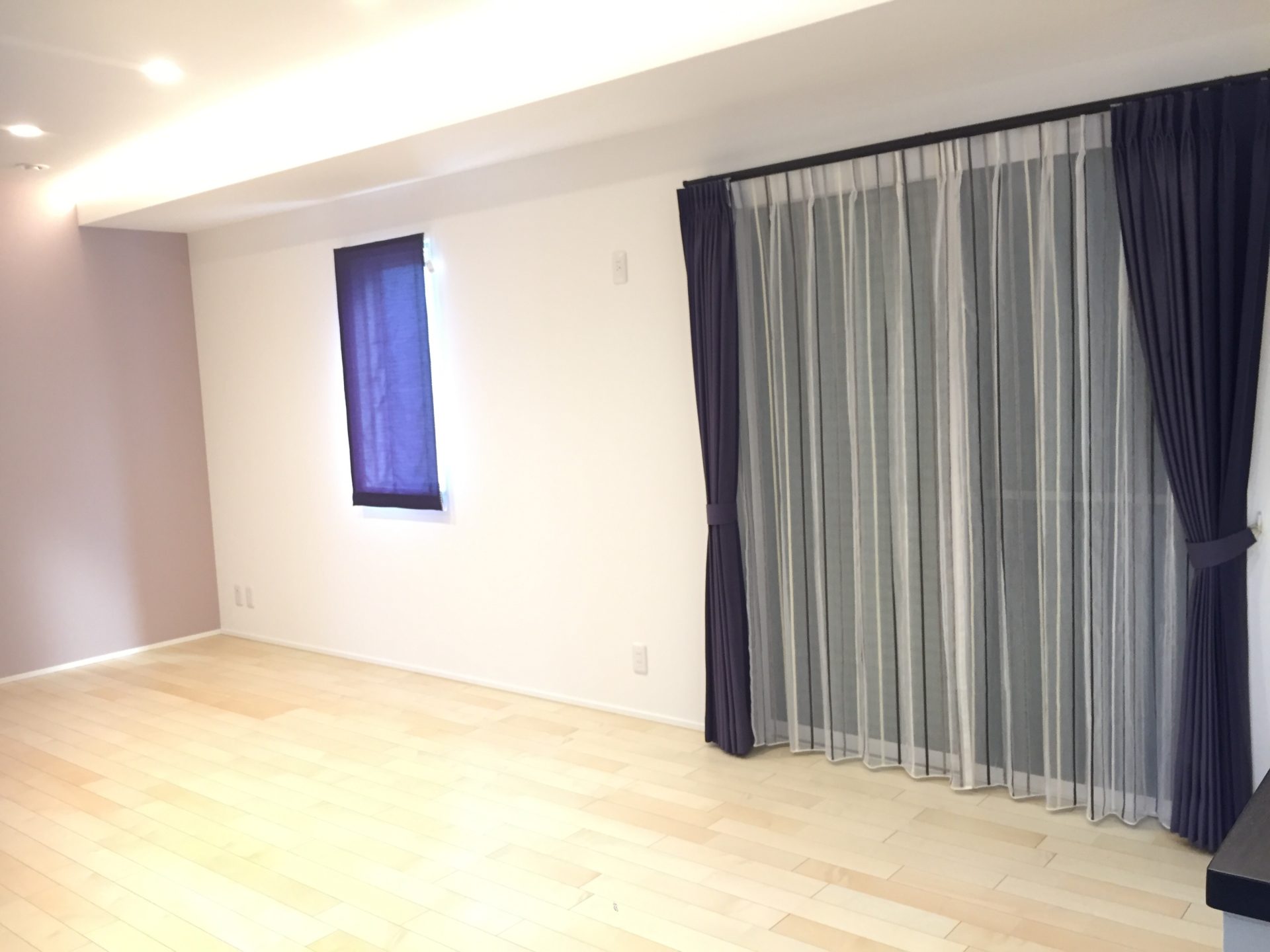 リビングのカーテン、濃い色だと 窓の両端がビシッと締まった感じになって モダンなデザインにしっくりきます。