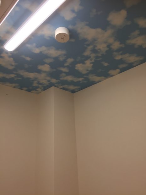 なんでもなくてもちょっと緊張するレントゲン室には、入った瞬間だけでも、気分転換できるように空の天井クロス。