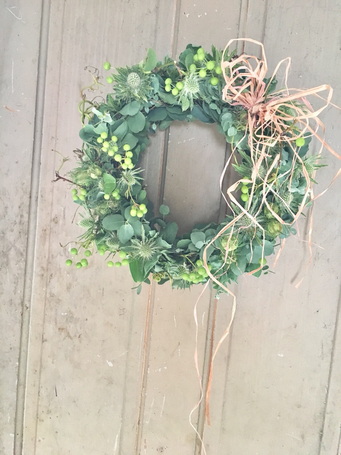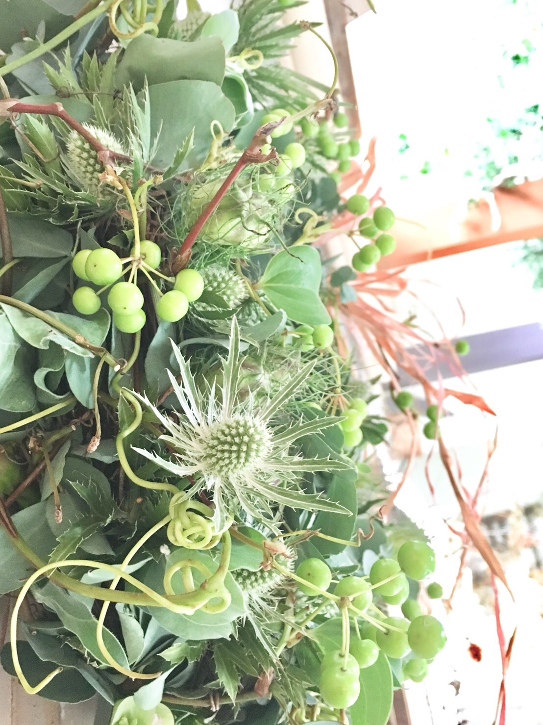 観葉植物として使いたかったユーカリは 室内では育ちにくいそうで あきらめたのですが、リースに使っていただきました。このままドライになっていっても飾っていただけます。