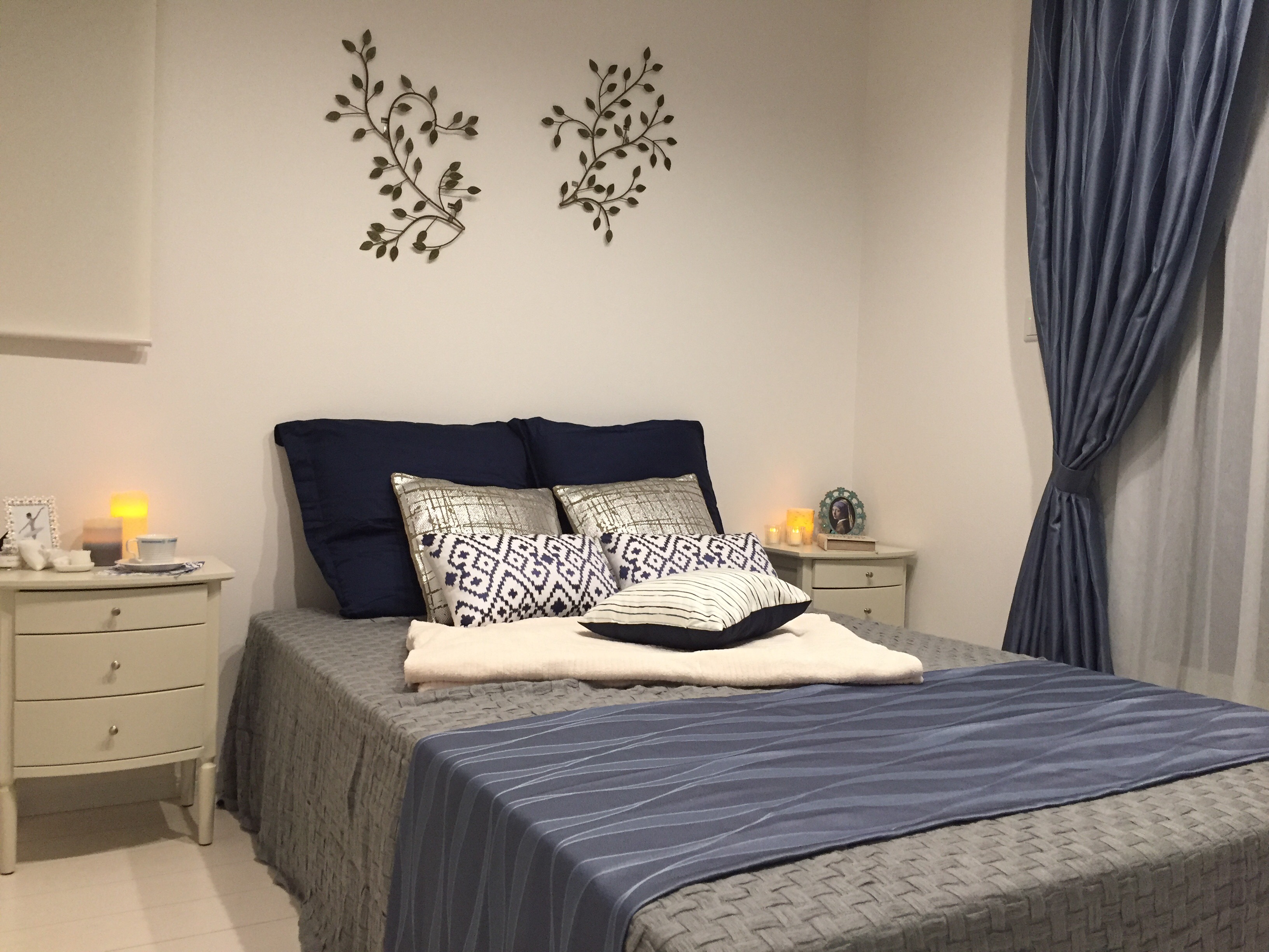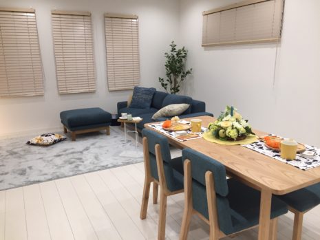 玄関にブルーグレーのアクセントクロスのある家なので、寝室はネイビー貴重のお部屋。