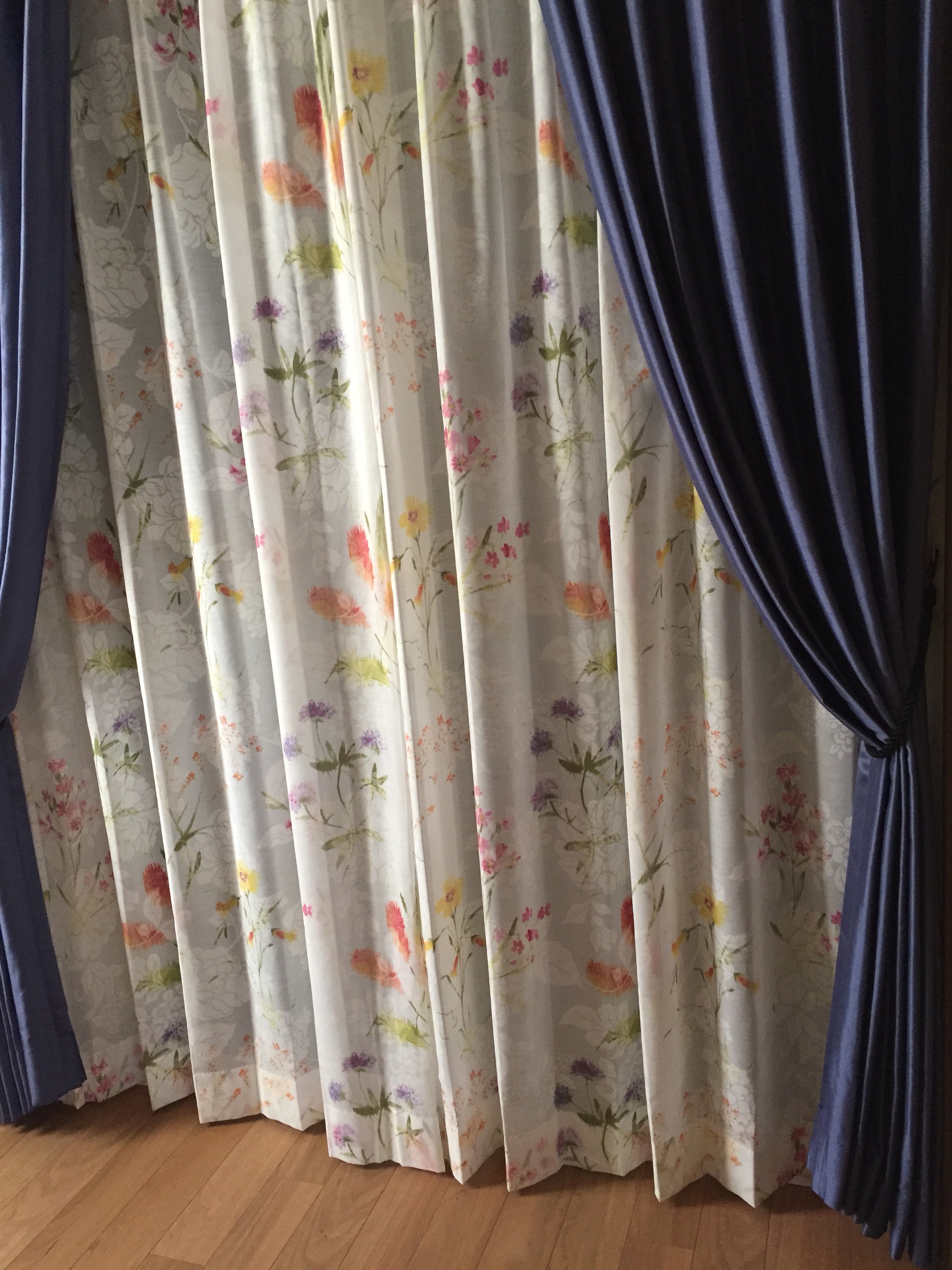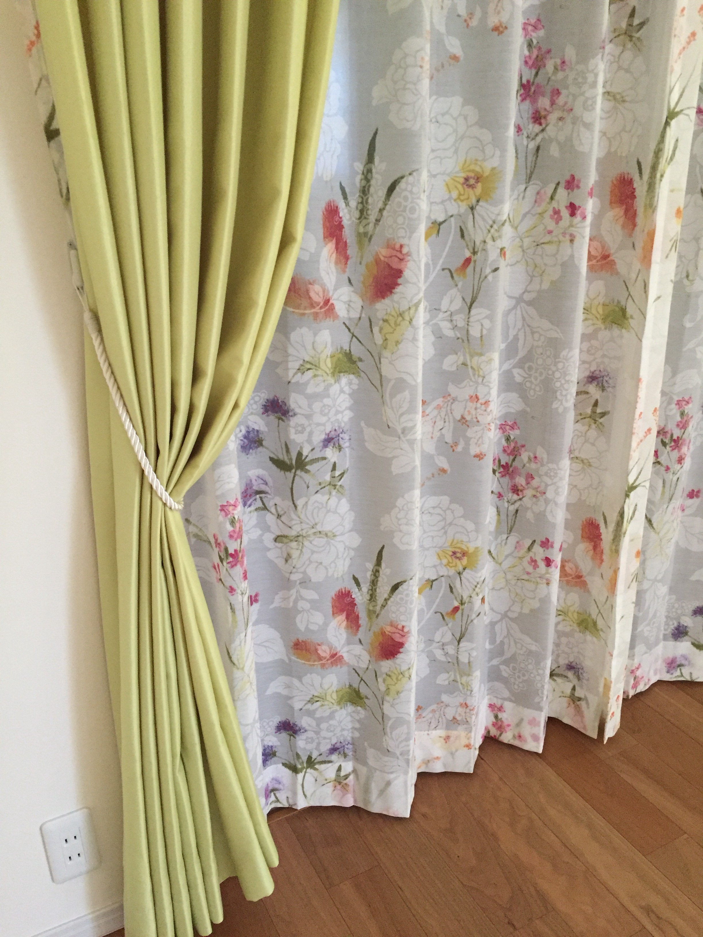 両開きのカーテンはレースが窓よりにで前後反対に。