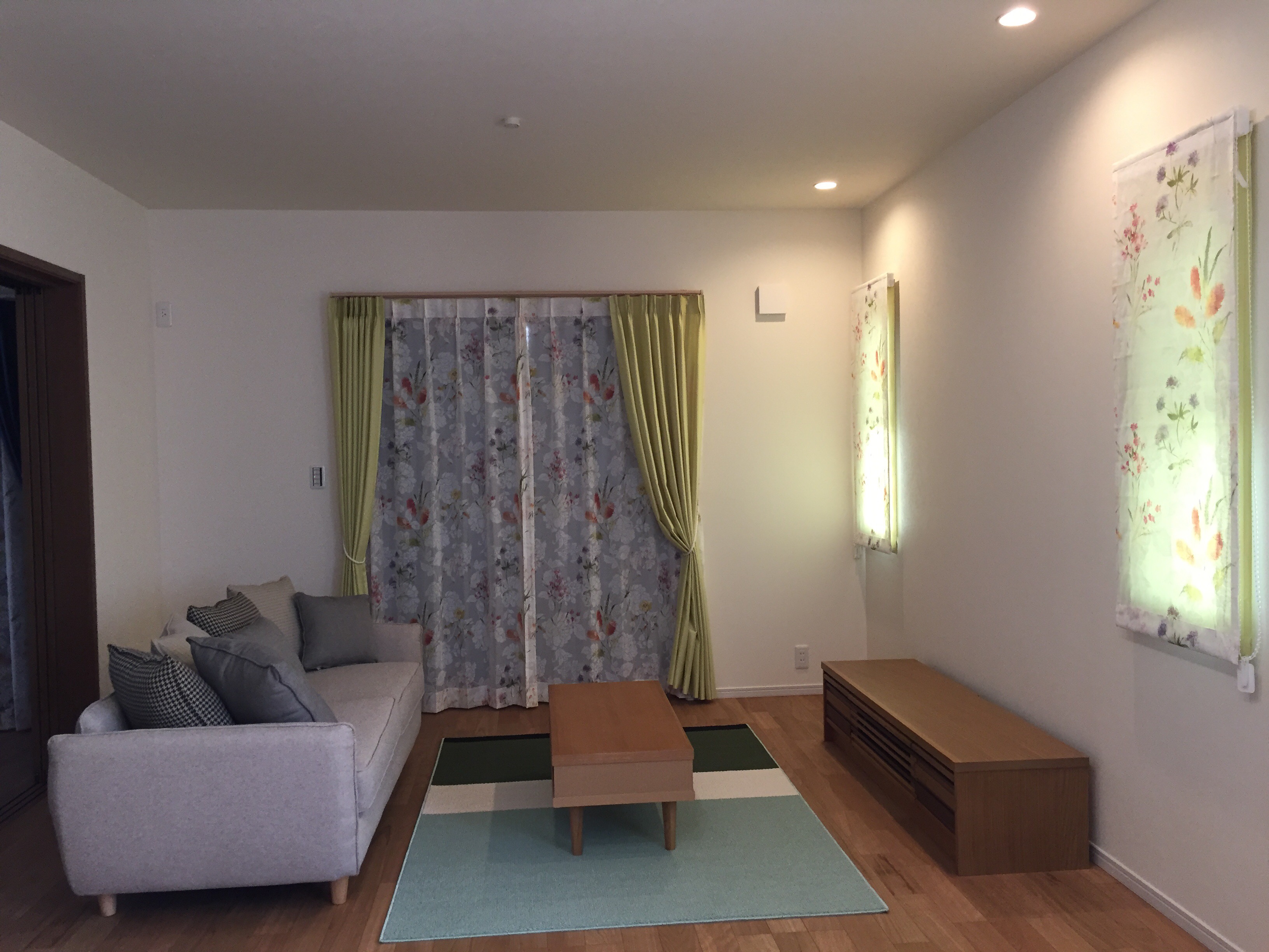 ソファーはグレー系のクッションをたくさん並べて、かわいい雰囲気のお部屋になりました。