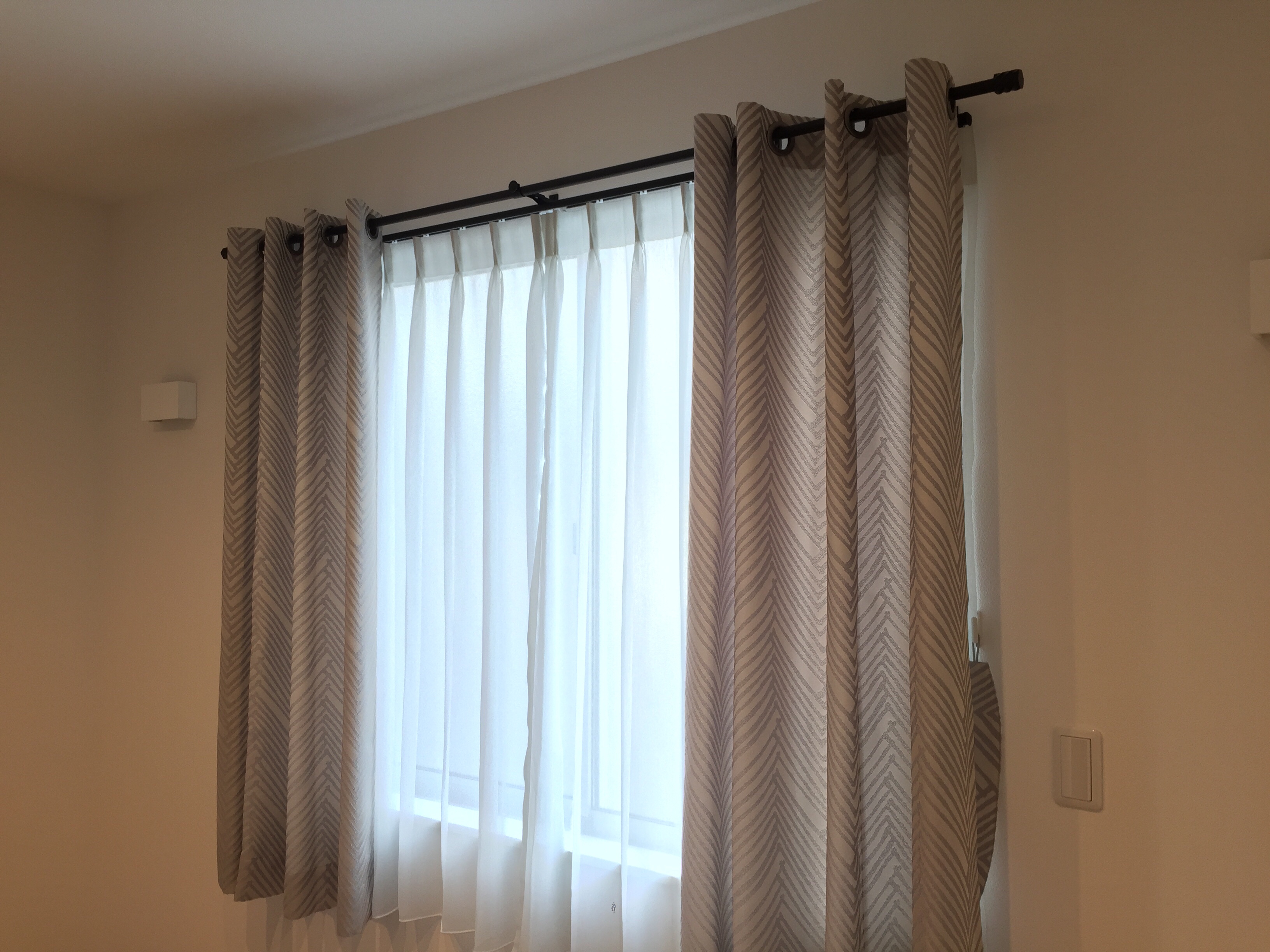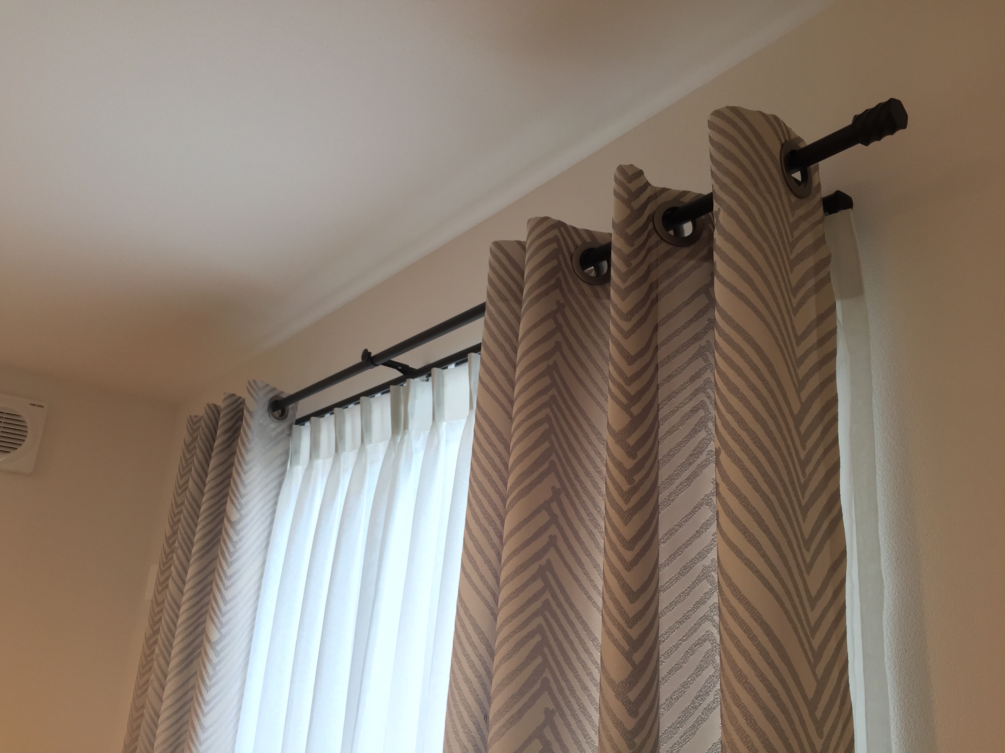 カーテン生地に直接穴をあけて、金属のハトメリングでレールに通す。