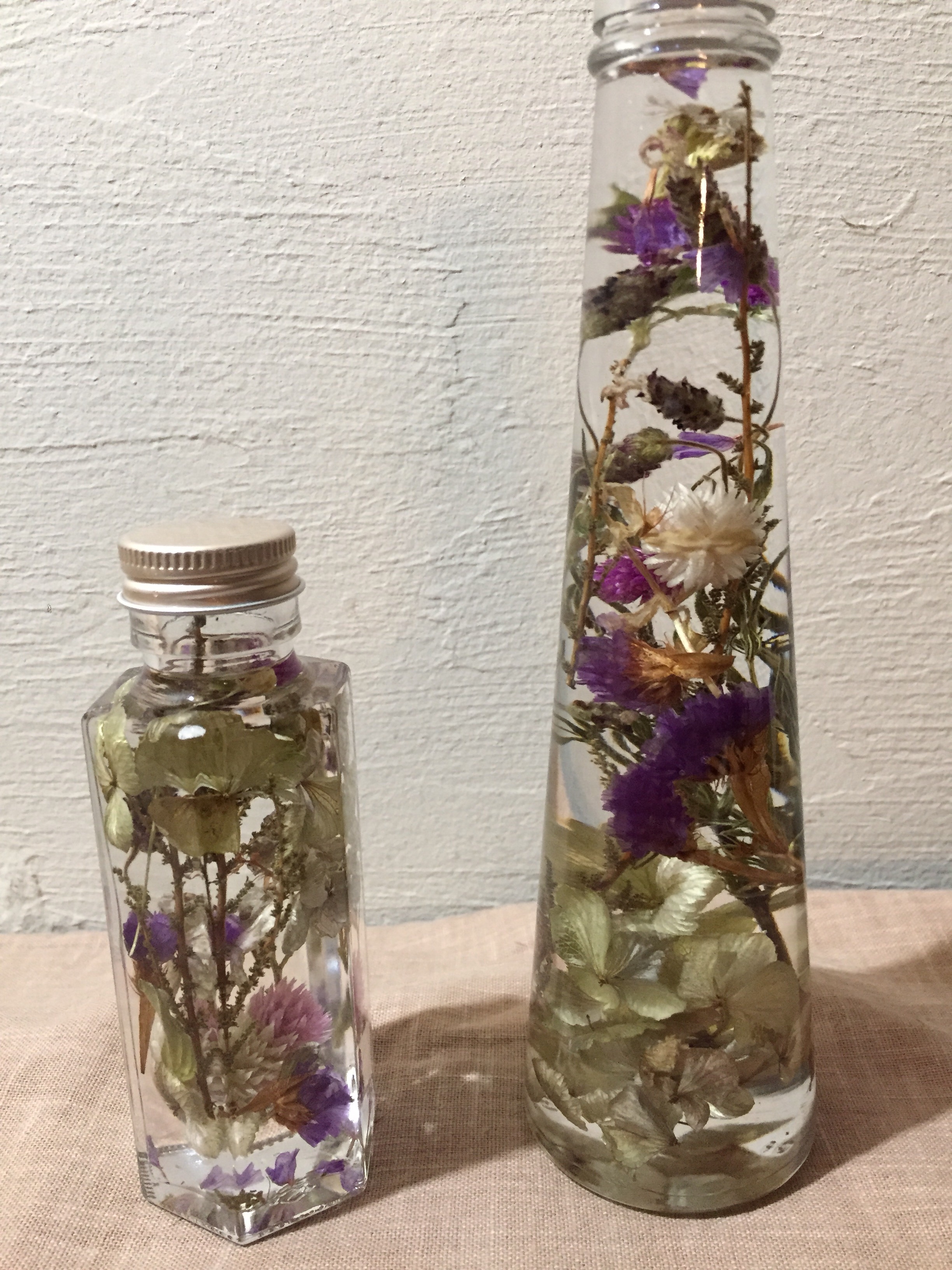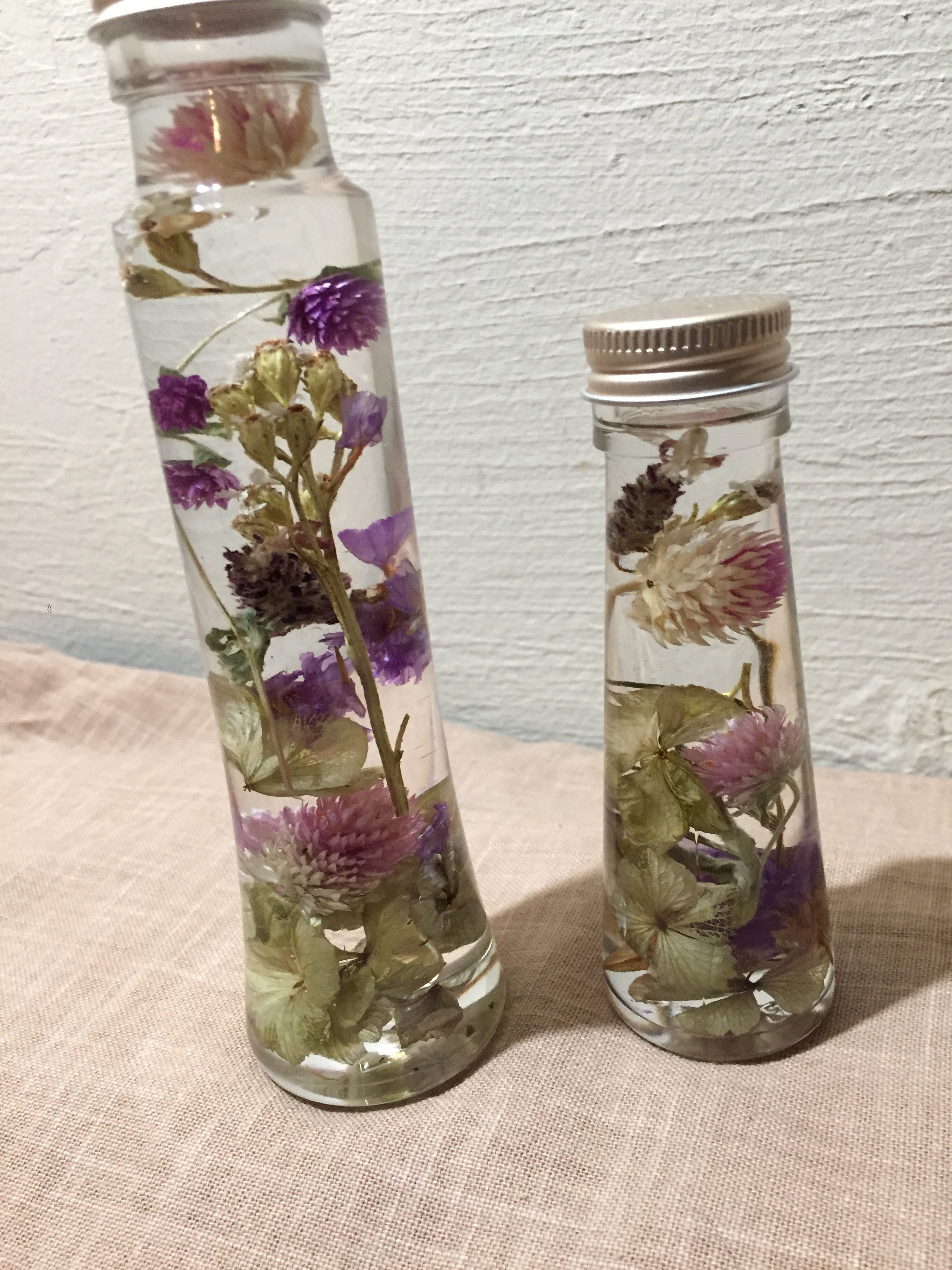 ドライフラワーやプリザーブドフラワーなどをオイルにつけて飾るというインテリア小物には もってこいのもの。