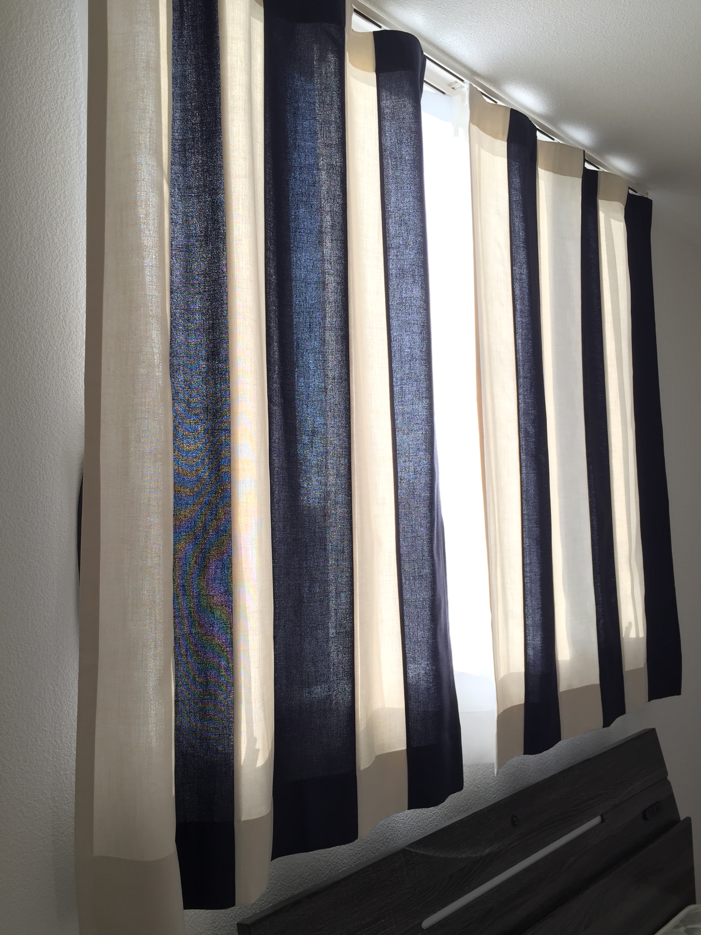 15cmくらいの短冊にした2色のカーテンを縫い合わせてます。