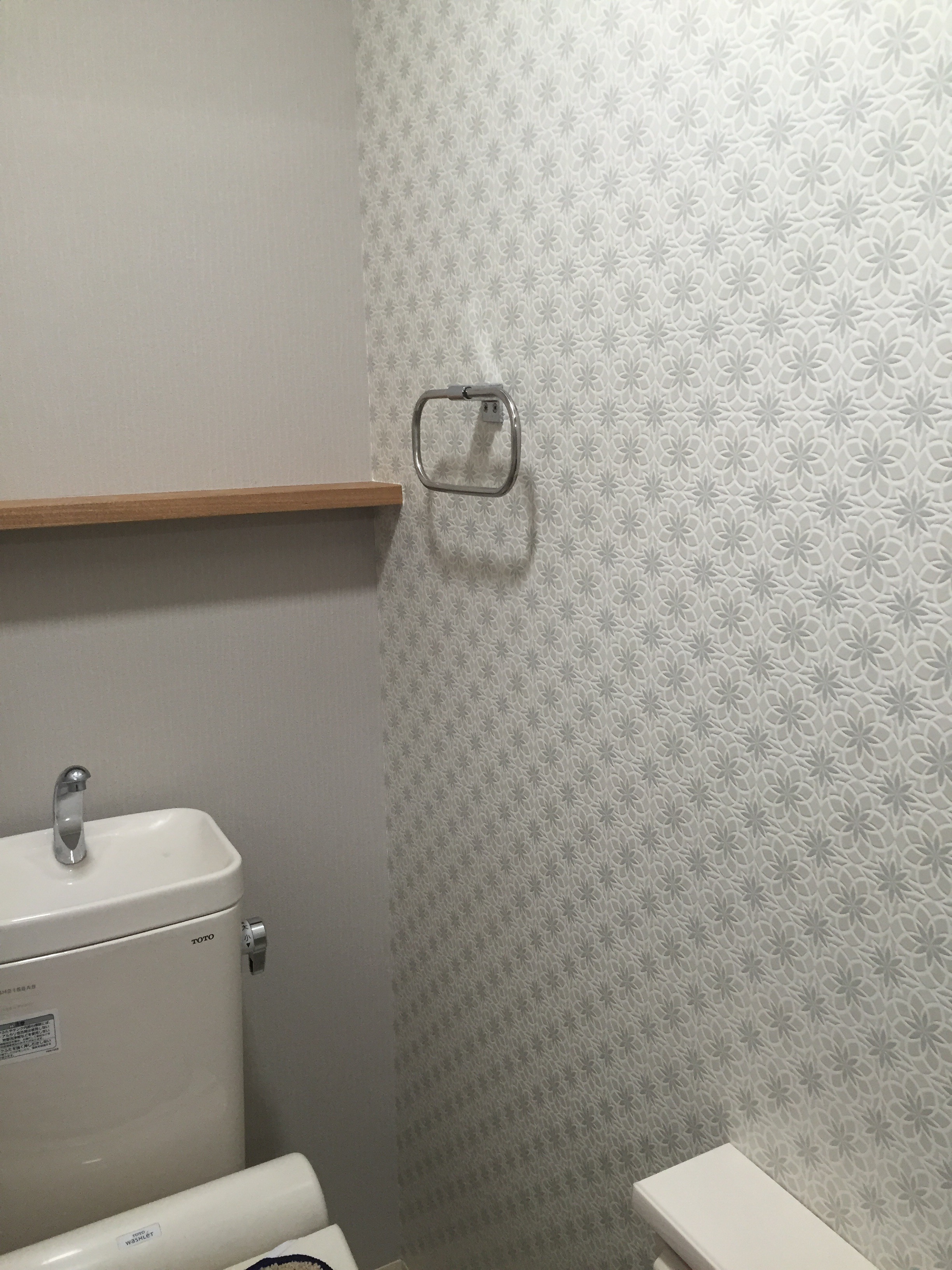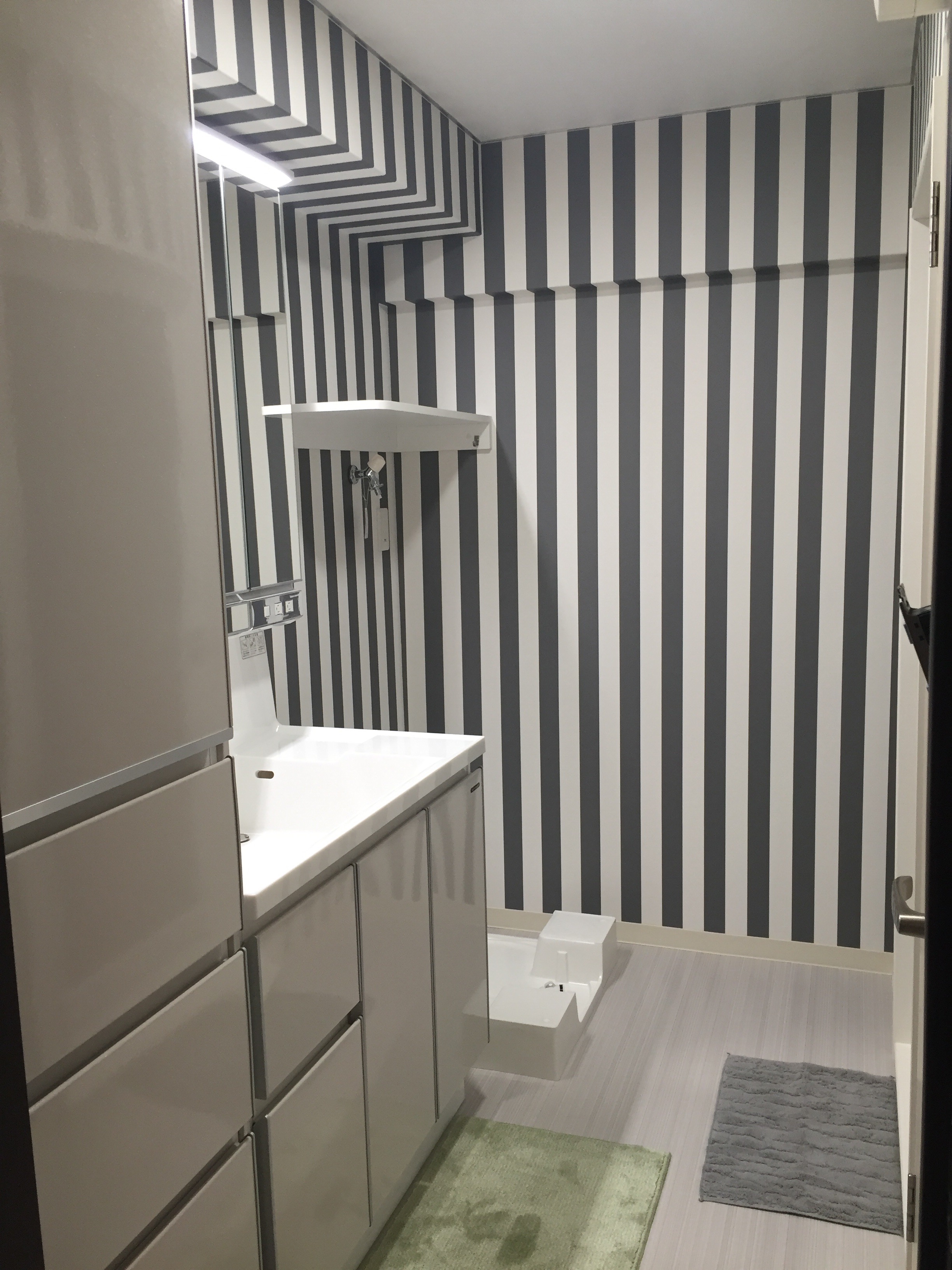 洗面室は 洗濯機が設置されるとほとんど壁面なし。 遊びごころありのクロス。