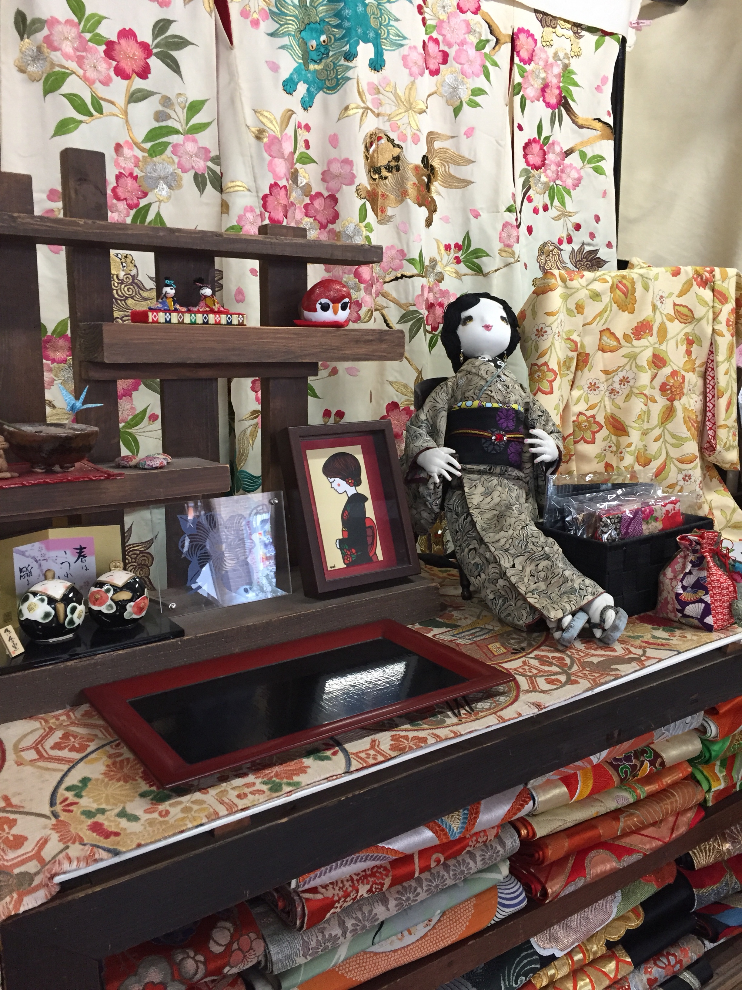 お店の中のレイアウトを変えるのがメインで買い足したのは 着物の組み合わせを展示するテーブルのみというコーディネートをしたお店です。