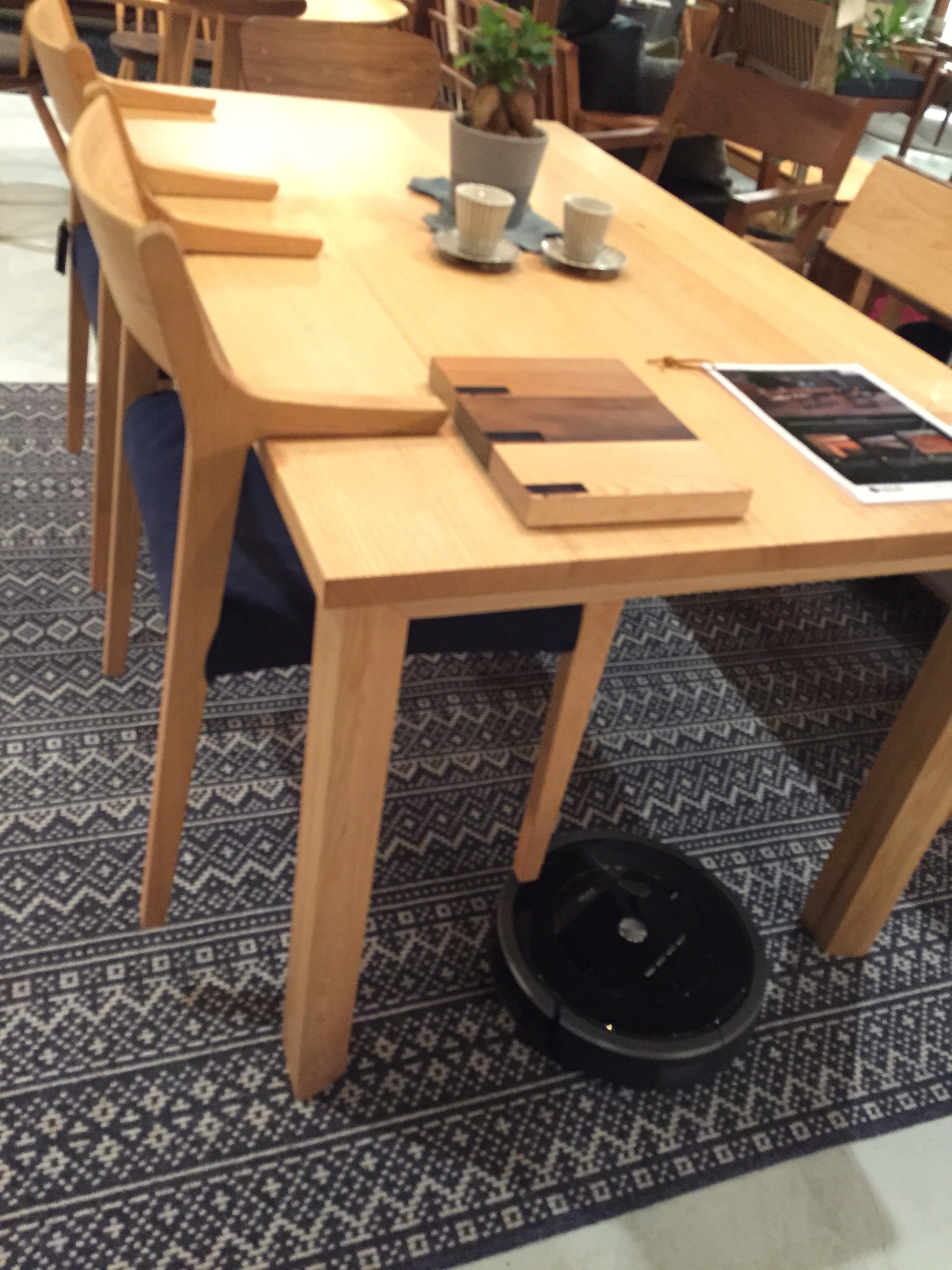 ルンバが通れるように イスをテーブルに引っ掛けることができるとか。