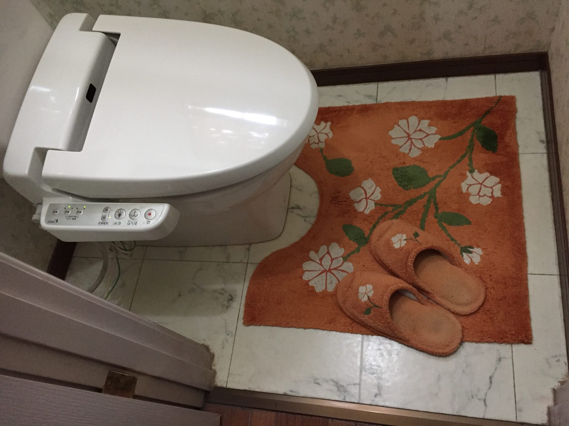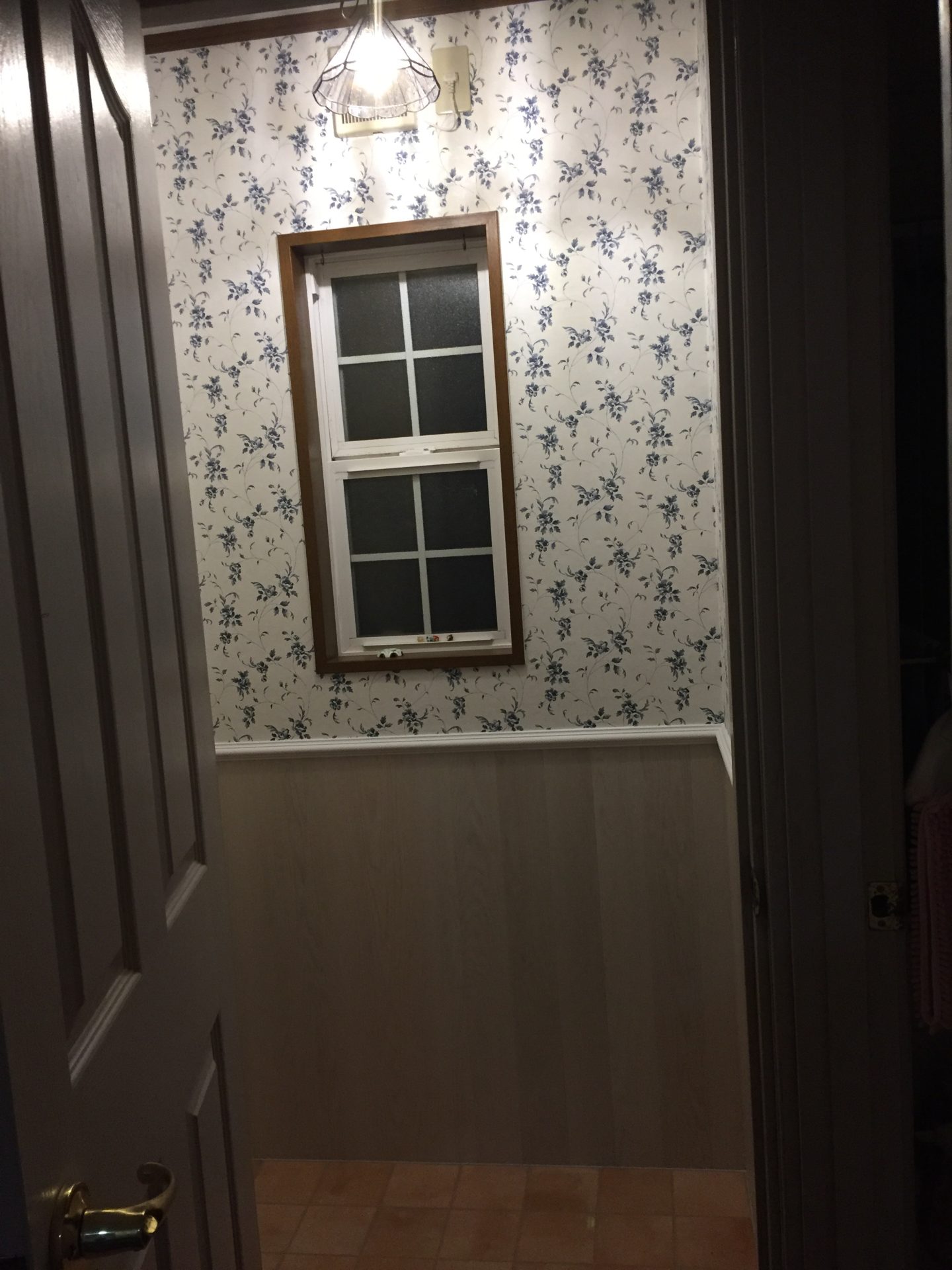 白っぽい壁紙を剥がして下地処理して、オレンジの壁紙を貼っていきます。