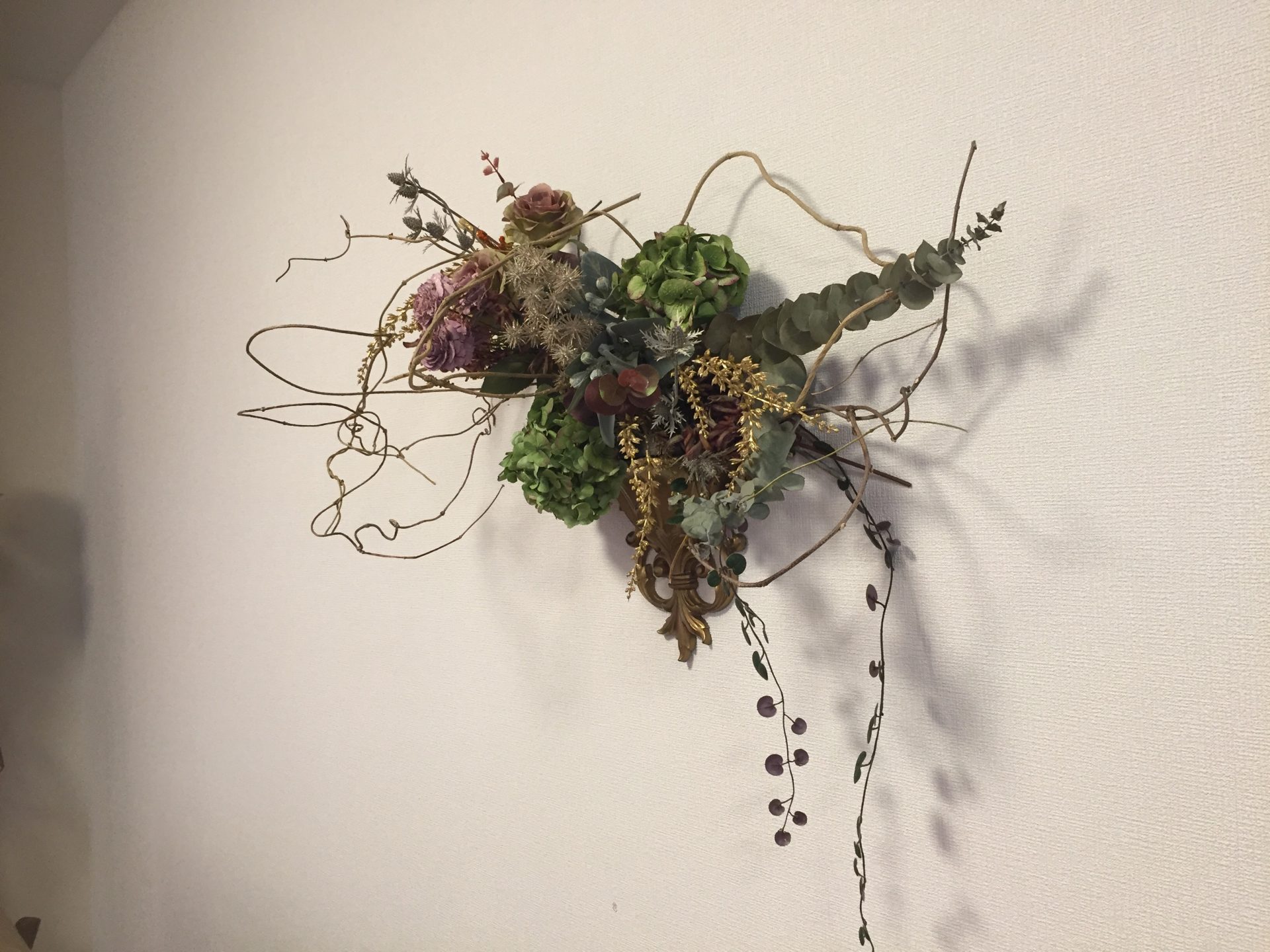ドライフラワーのようなシャビーな色合いの造花を使っています。