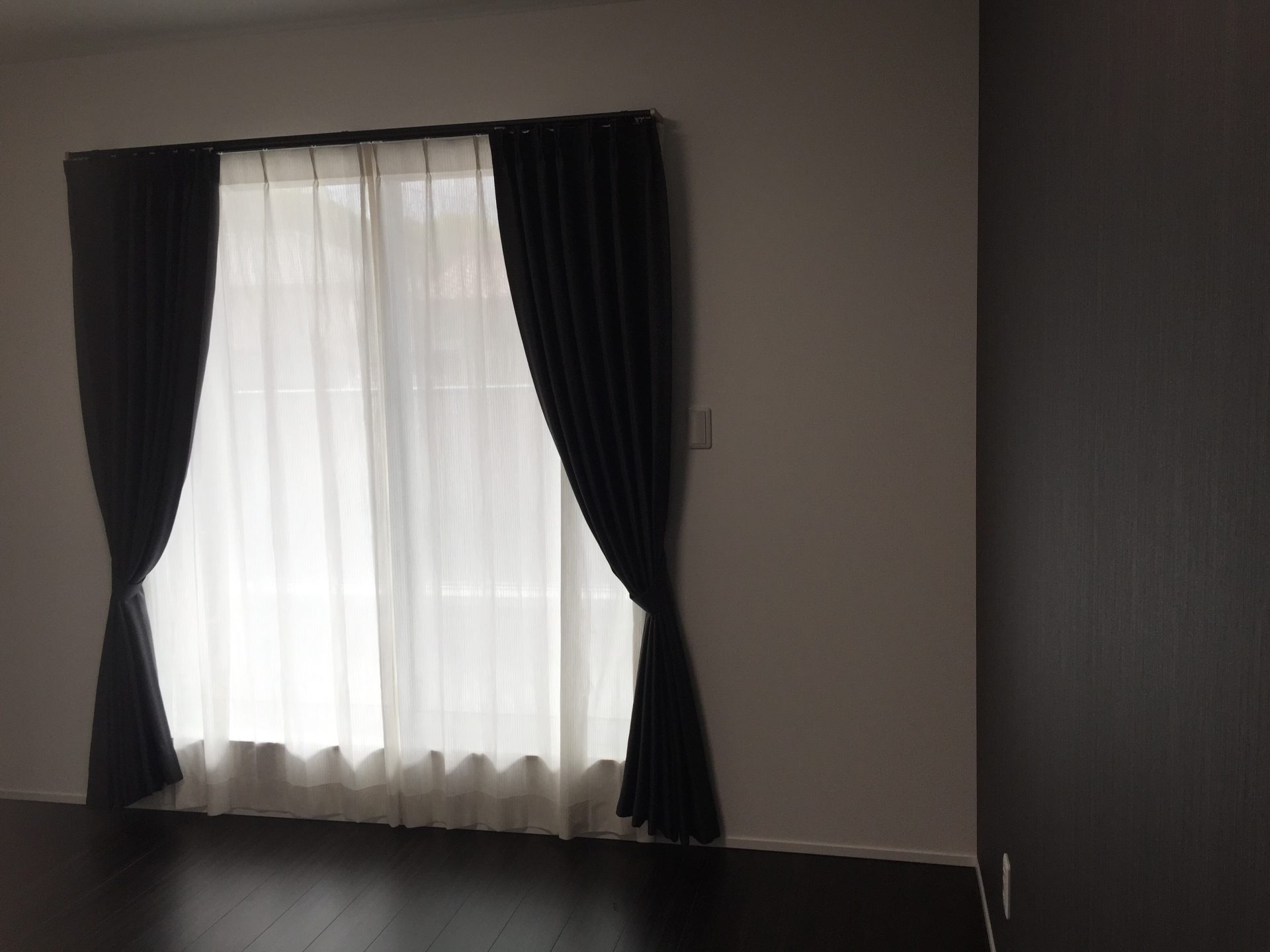 濃いグレーの壁紙にブラックのカーテン。暗くないですか?ってよく聞かれる組み合わせ。