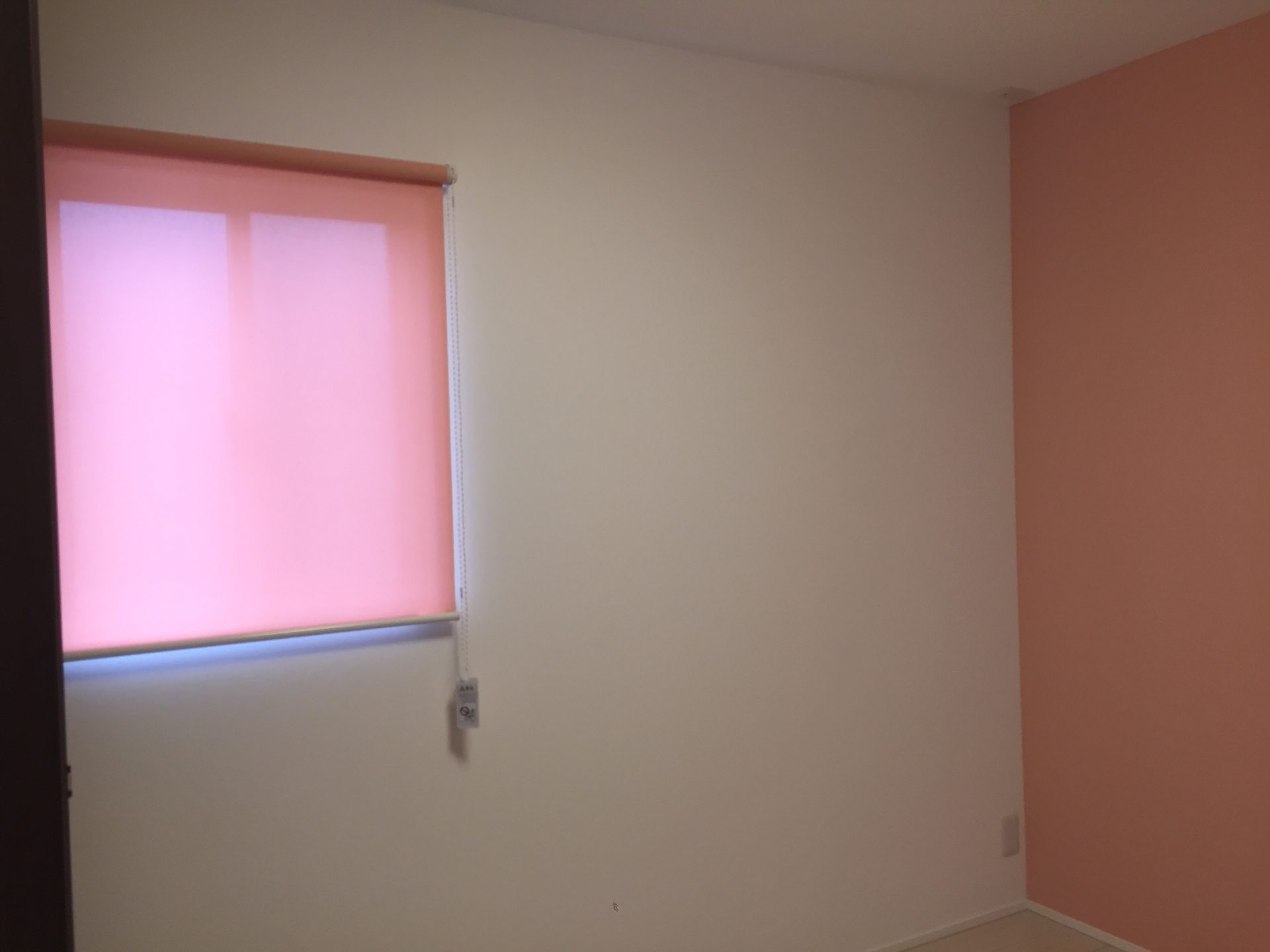 サーモンピンクのアクセントクロスとそれに似た色のロールスクリーン。