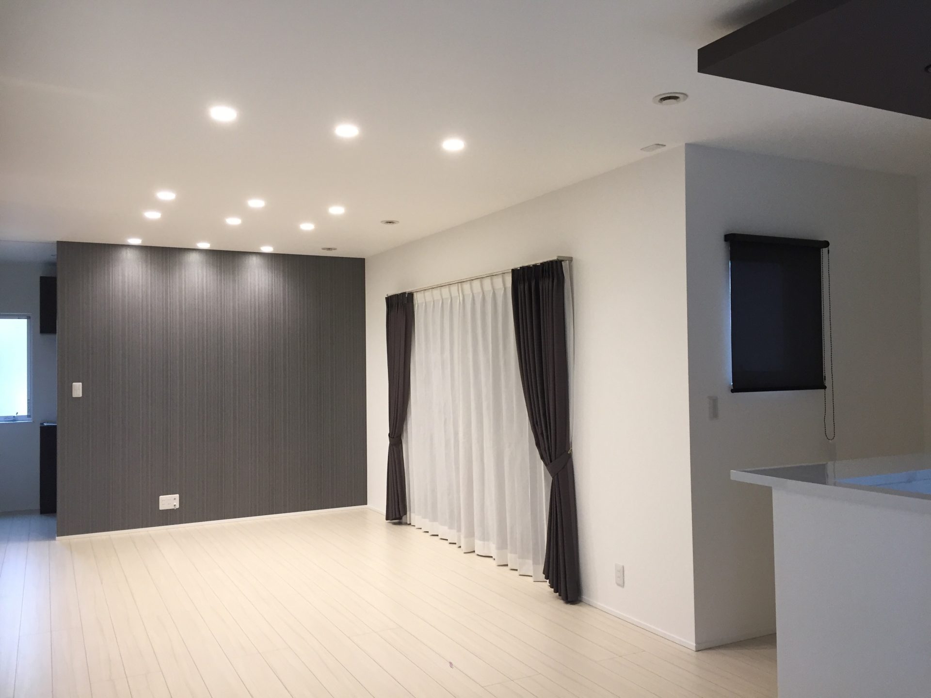 ご新築、アクセントクロスとカーテンの色調を合わせてみた例です。
