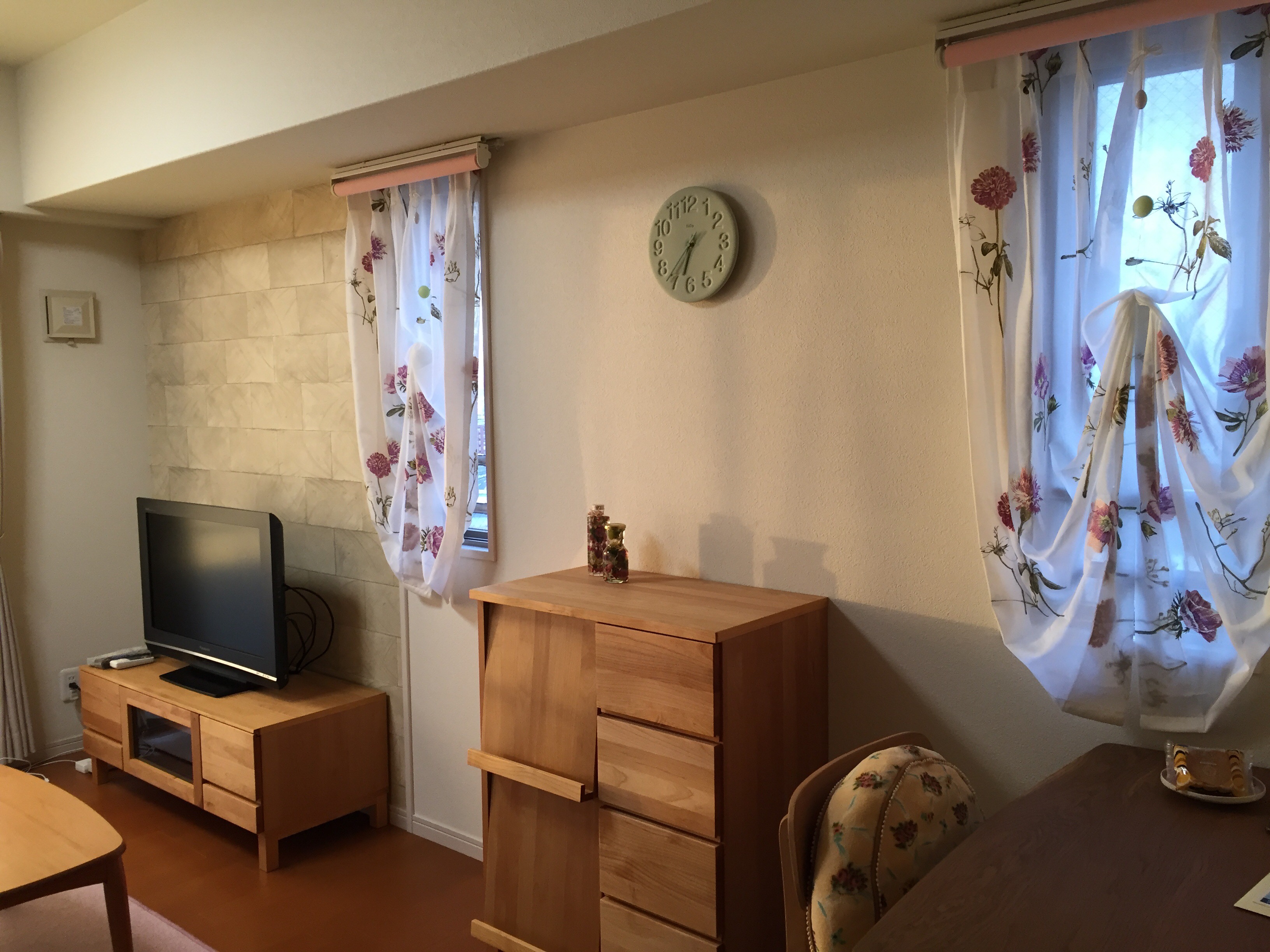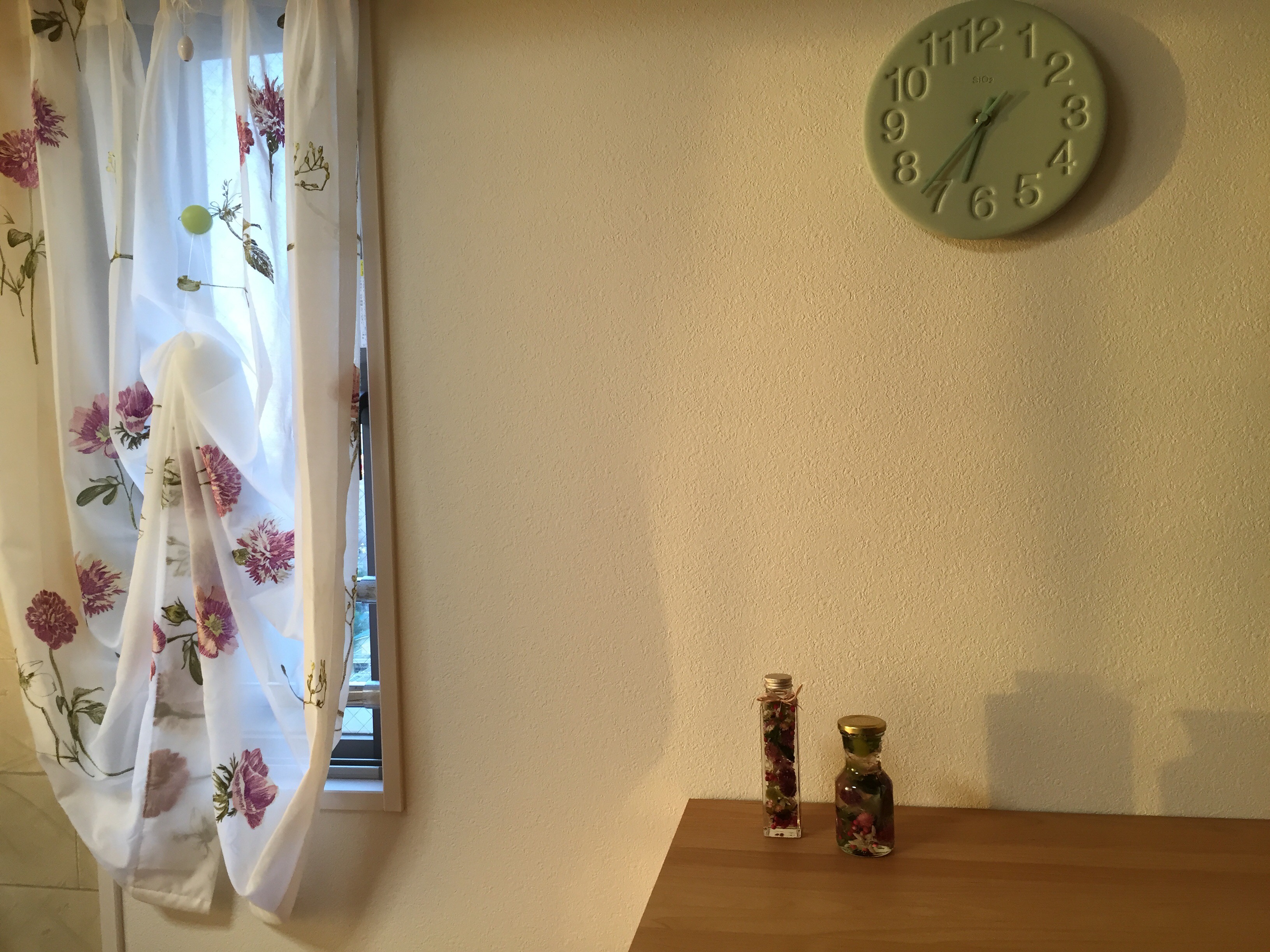 小さく写っているハーバリウムはローズを基調とした カーテンの色にあわせてもらいました。