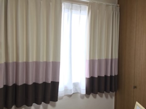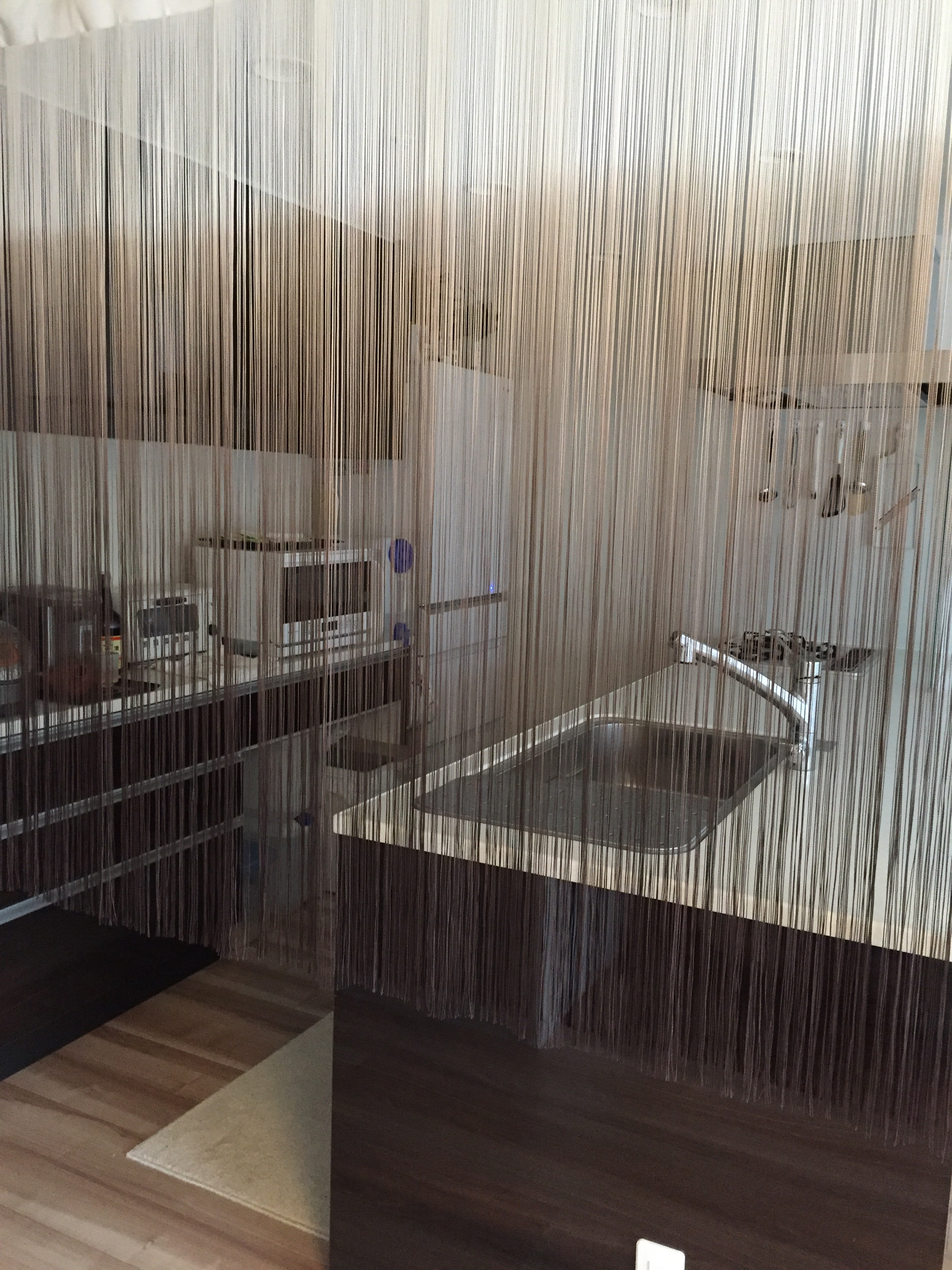 出入りするところは ストリングスカーテン。のれんのように出入のたびに動かす必要なし。ですが 上部はカーテンレールなので、どちらかに束ねることもできます。