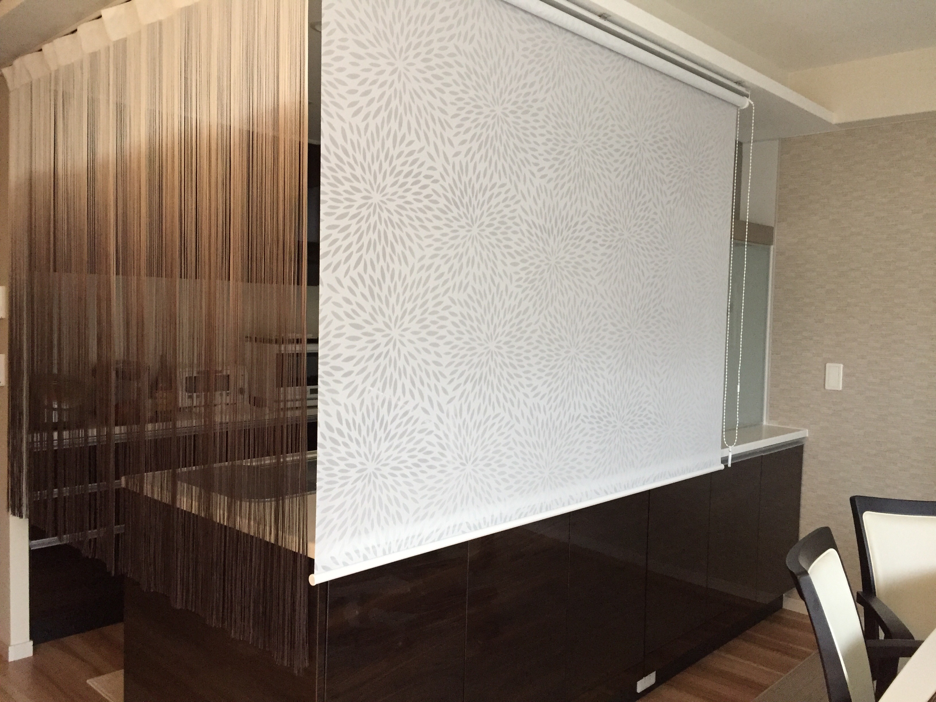 正面はシースルーのロールスクリーン、コンロ前の透明ガラスにはガラスフィルムを貼っています。