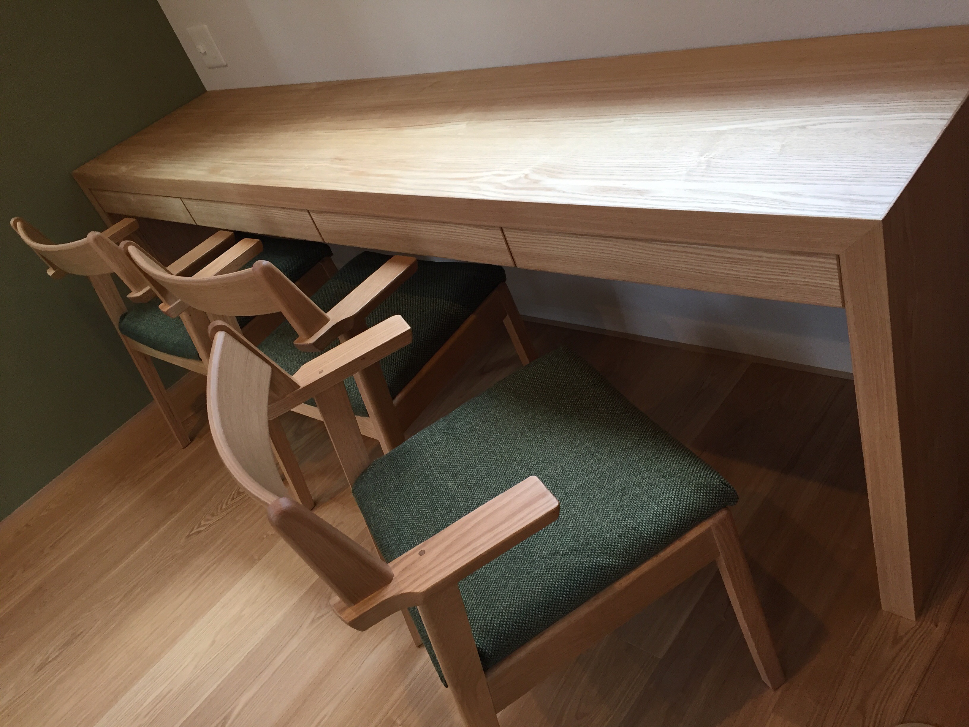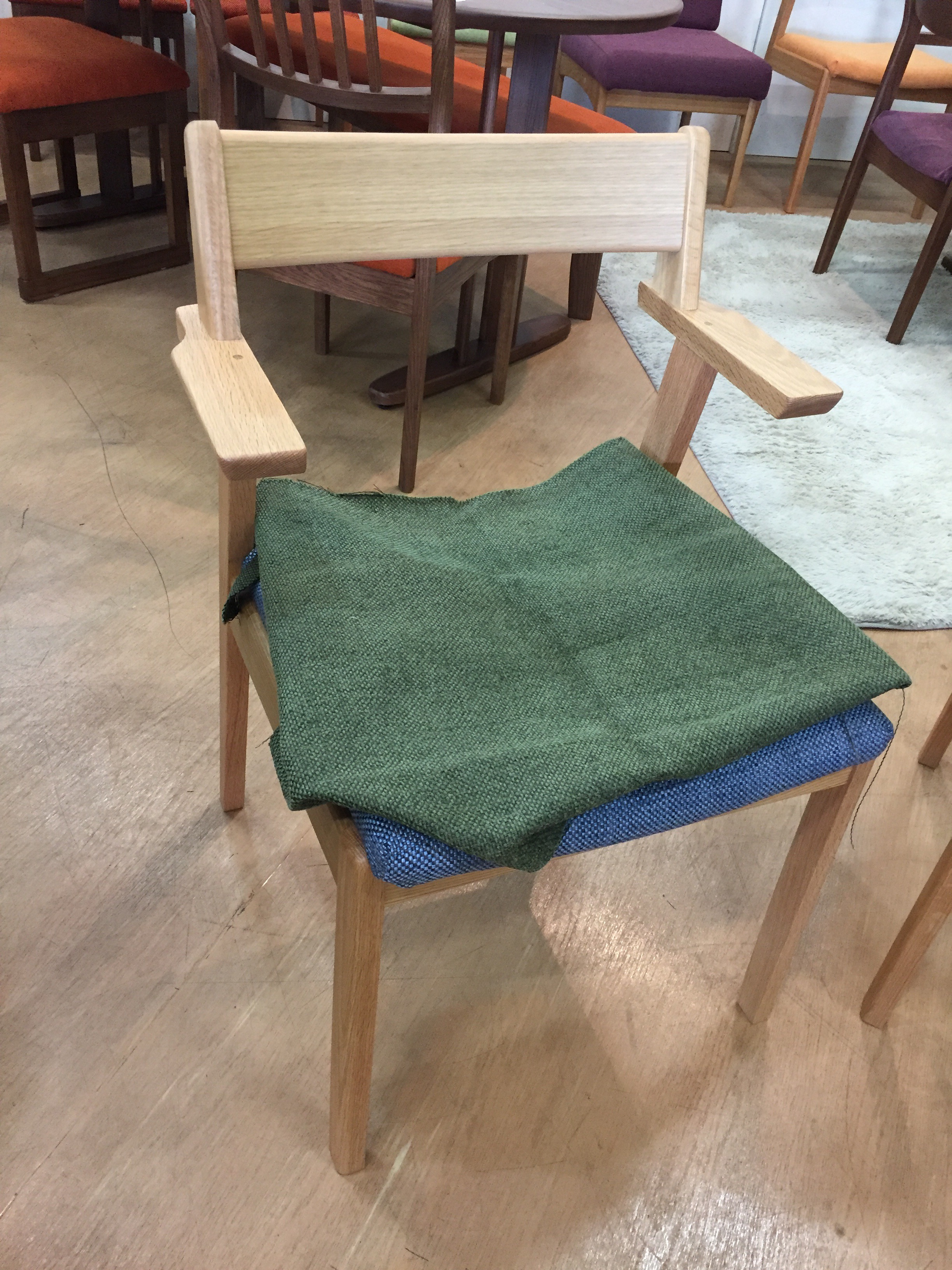 座面の色 投稿日 2017年8月21日 著者 wpmaster カテゴリー インテリアコーディネート カテゴリー 家具 カタログの写真はこの座面の色。 他の色も対応しますとのことで、大川の家具メーカー 園田産業のショールームへ。 ブルー、グリーンもサンプルがあり 今回貼られていたクロスにピッタリの色が。 クロスは既に貼られていたので、この写真のイメージを見て。 納品されたイスたち。 ぴったり。 インテリアコーディネートほんだな