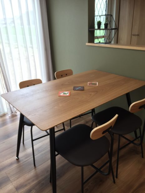 グリーンの強いカーキ色のアクセントクロスとホーローブラックのペンダントライトがあったので、その雰囲気に合わせた 家具とレースカーテン。