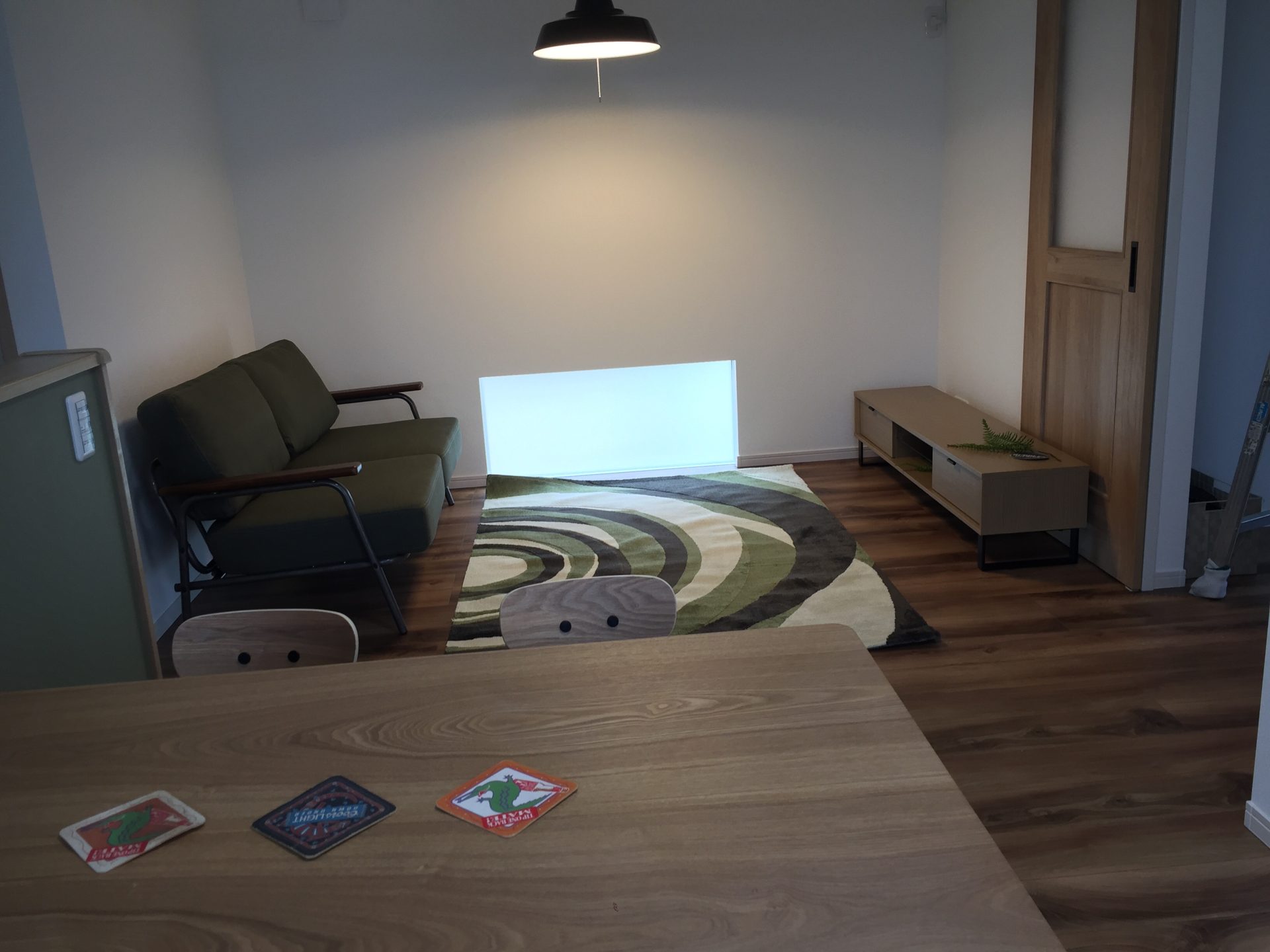 アクセントクロスに合わせたグリーンが入ったラグ。
