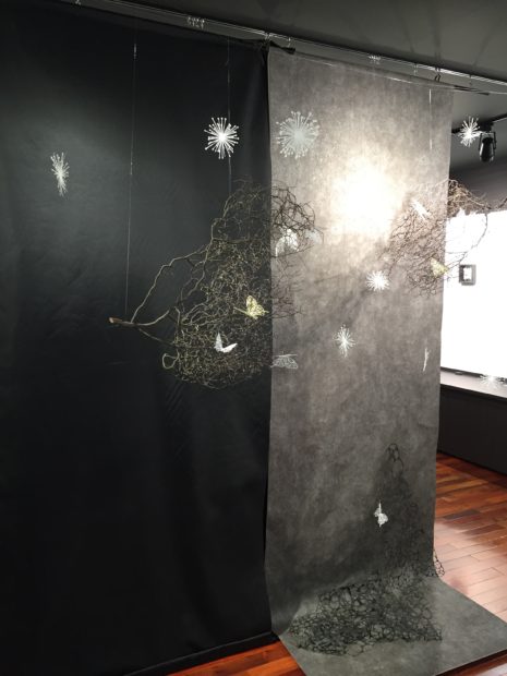 暗闇を舞う蝶と雪⁇床にも編み目が。