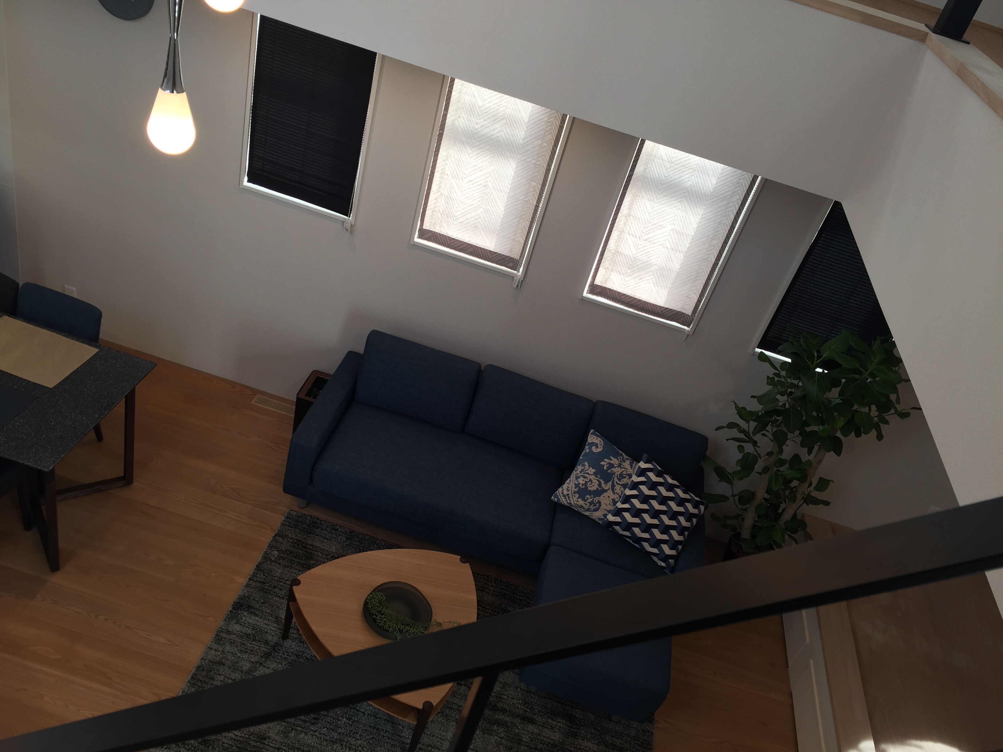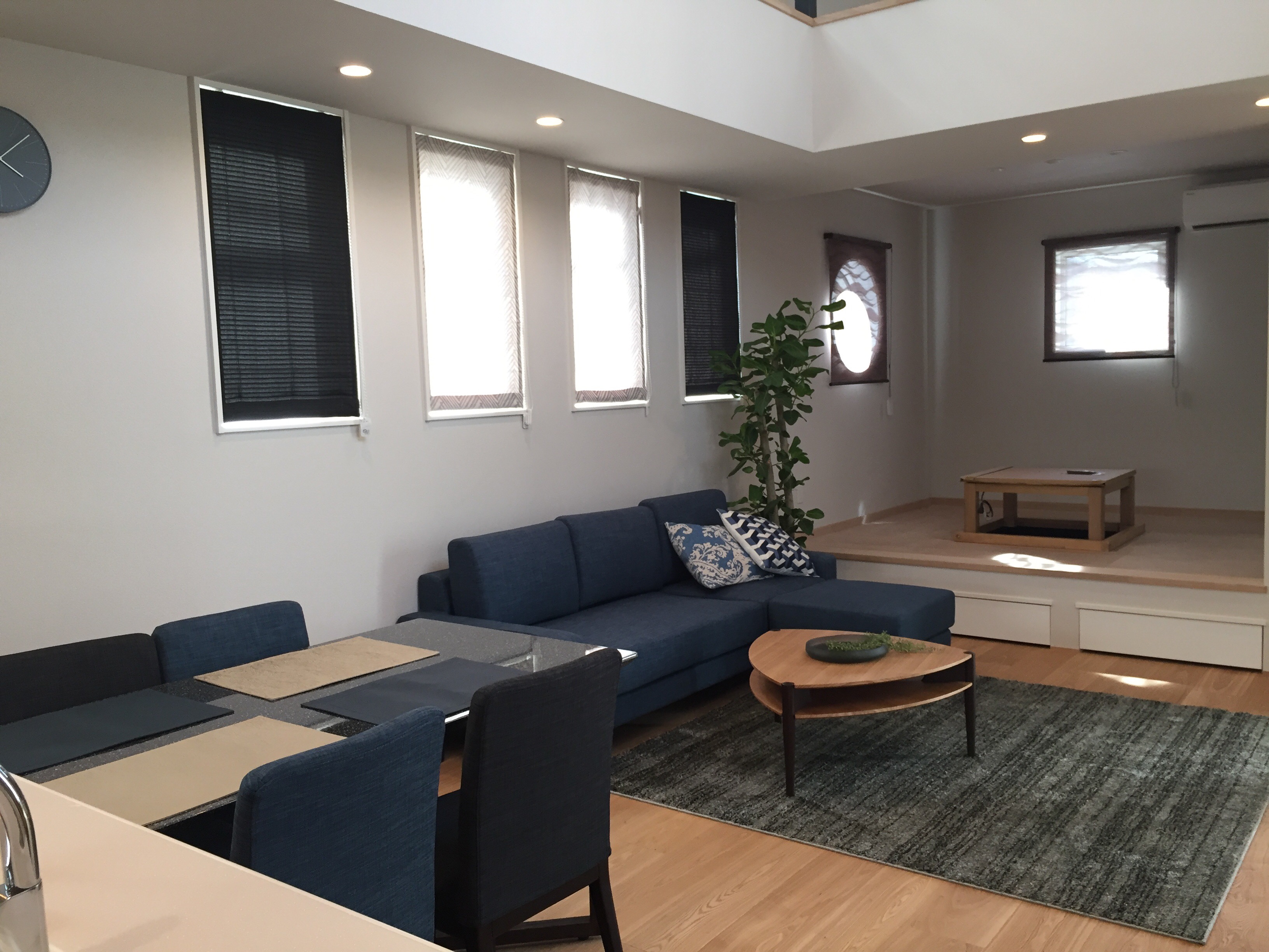 無垢材の床、ナチュラル色の建具。と柔らかい感じの内装でしたが、モダンなイメージでとのご要望により、チャコールグレーとネイビーのリビングに。