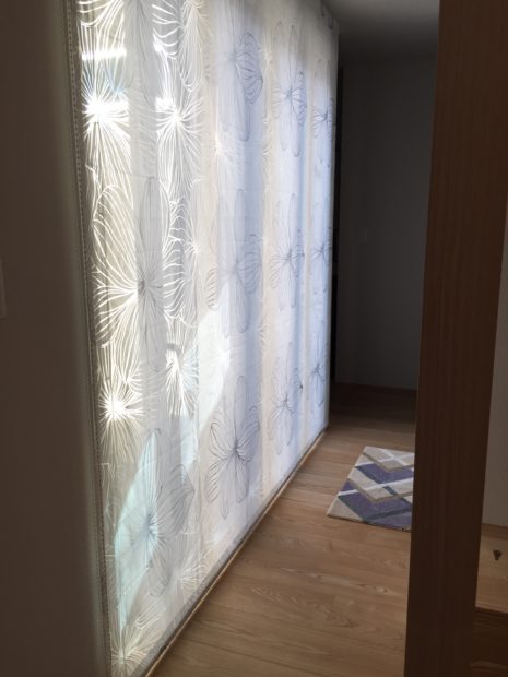 真ん中 2つの窓の生地はこの時にはまだ届いていないクッションとおそろい。