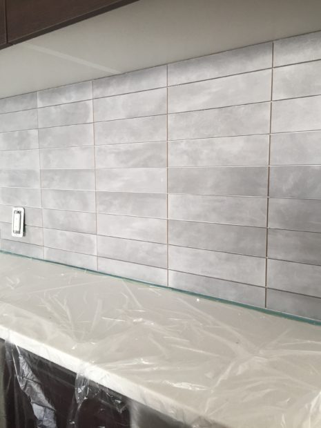 タイル施工中。 目地幅やタイル割りを職人さんと確認。