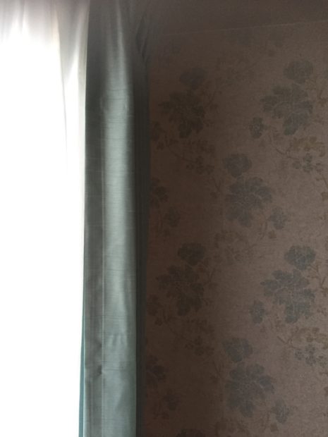 レースの柄が光の加減でわかりませんが、 クラシカルな植物柄がゴールドでさりげなくストライプになっています。 部屋全体に花柄のクロス。