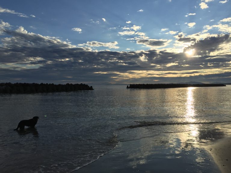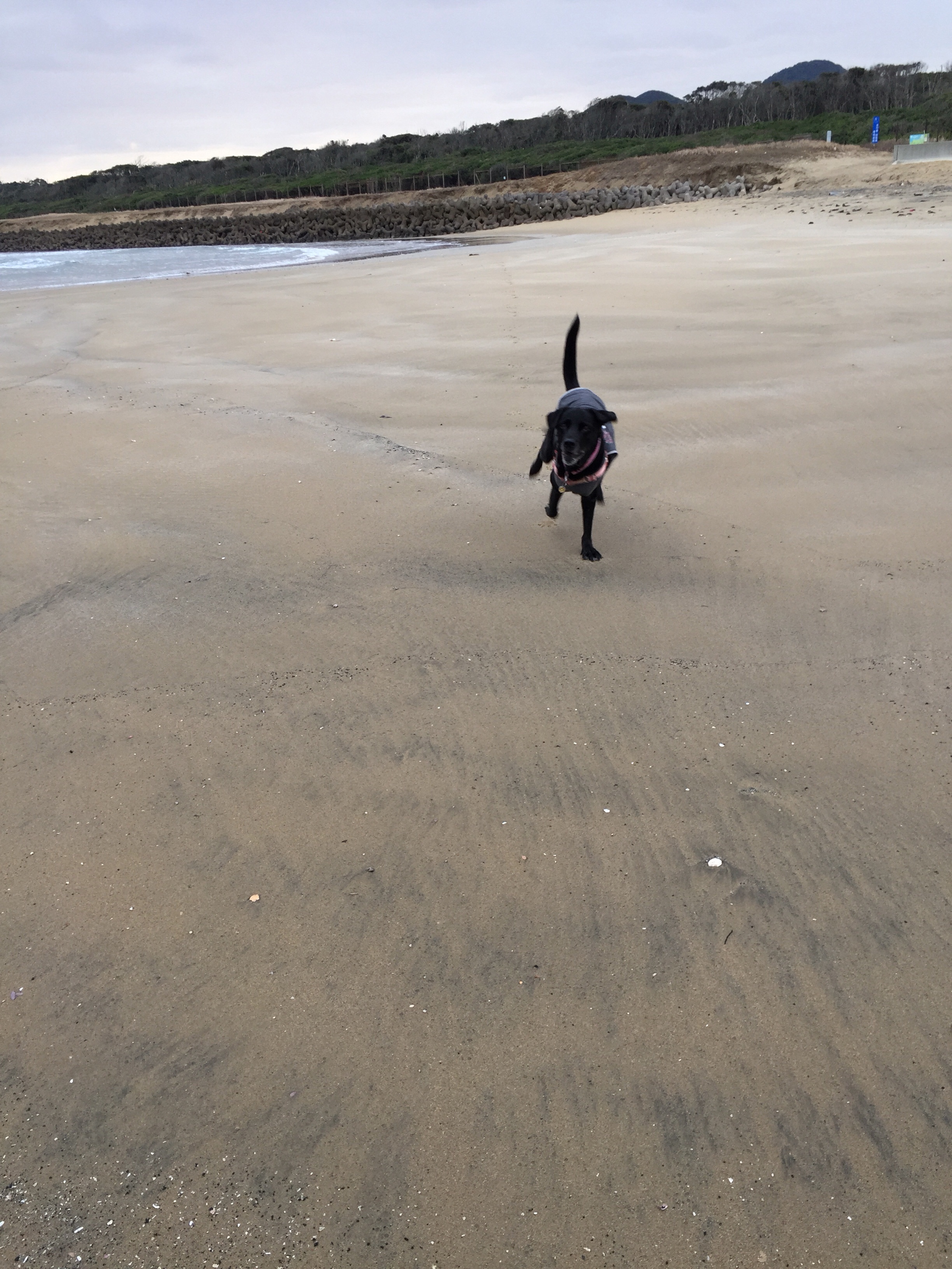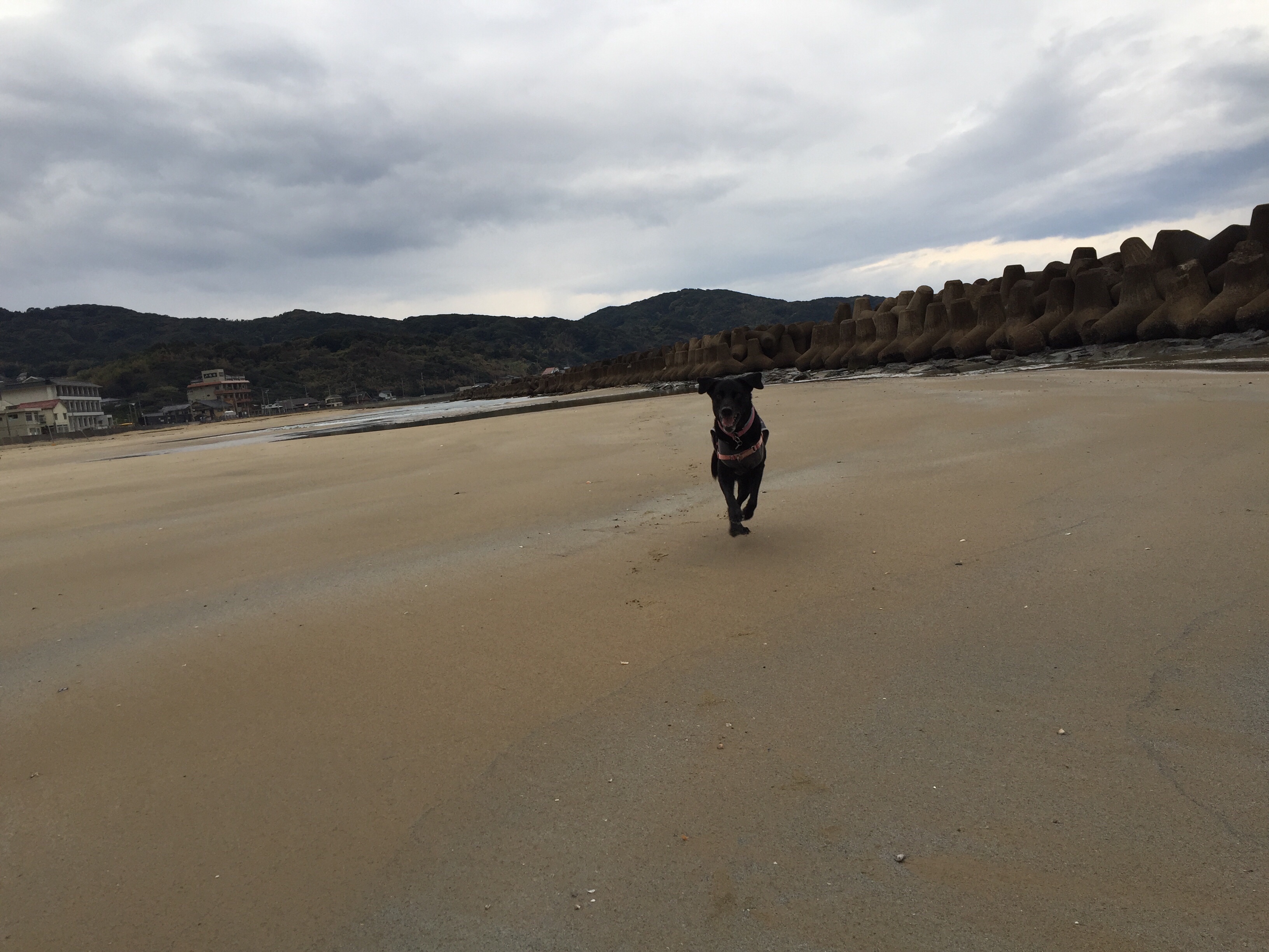 早朝でだーれも、ウォーキングの人もほかに犬の散歩の人もいない引き潮の海で走る。