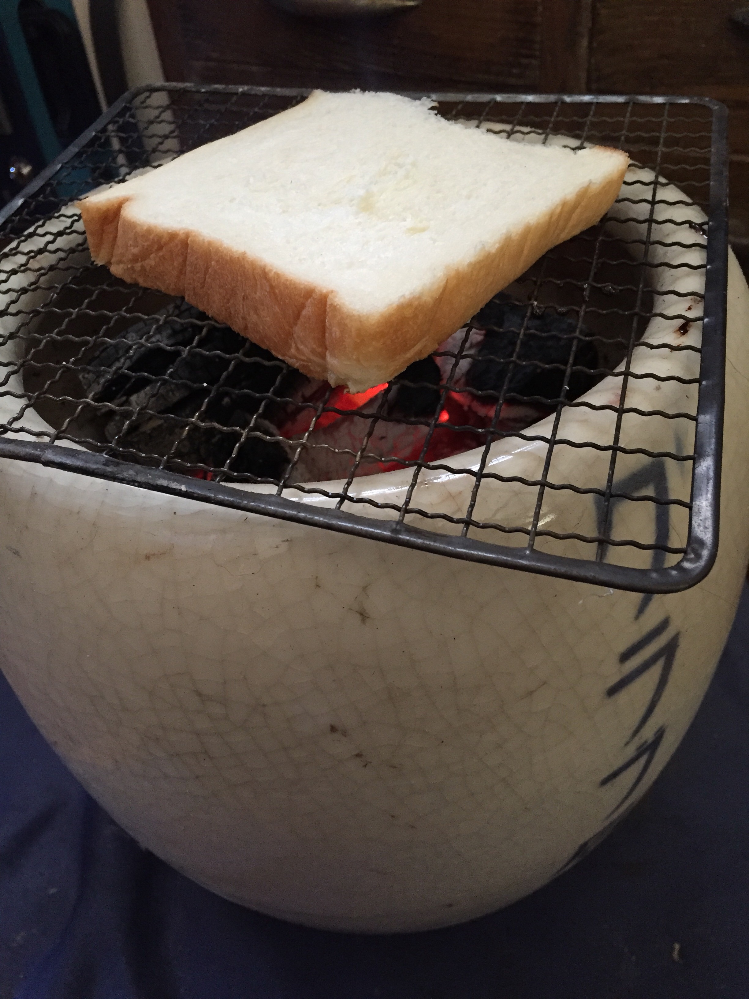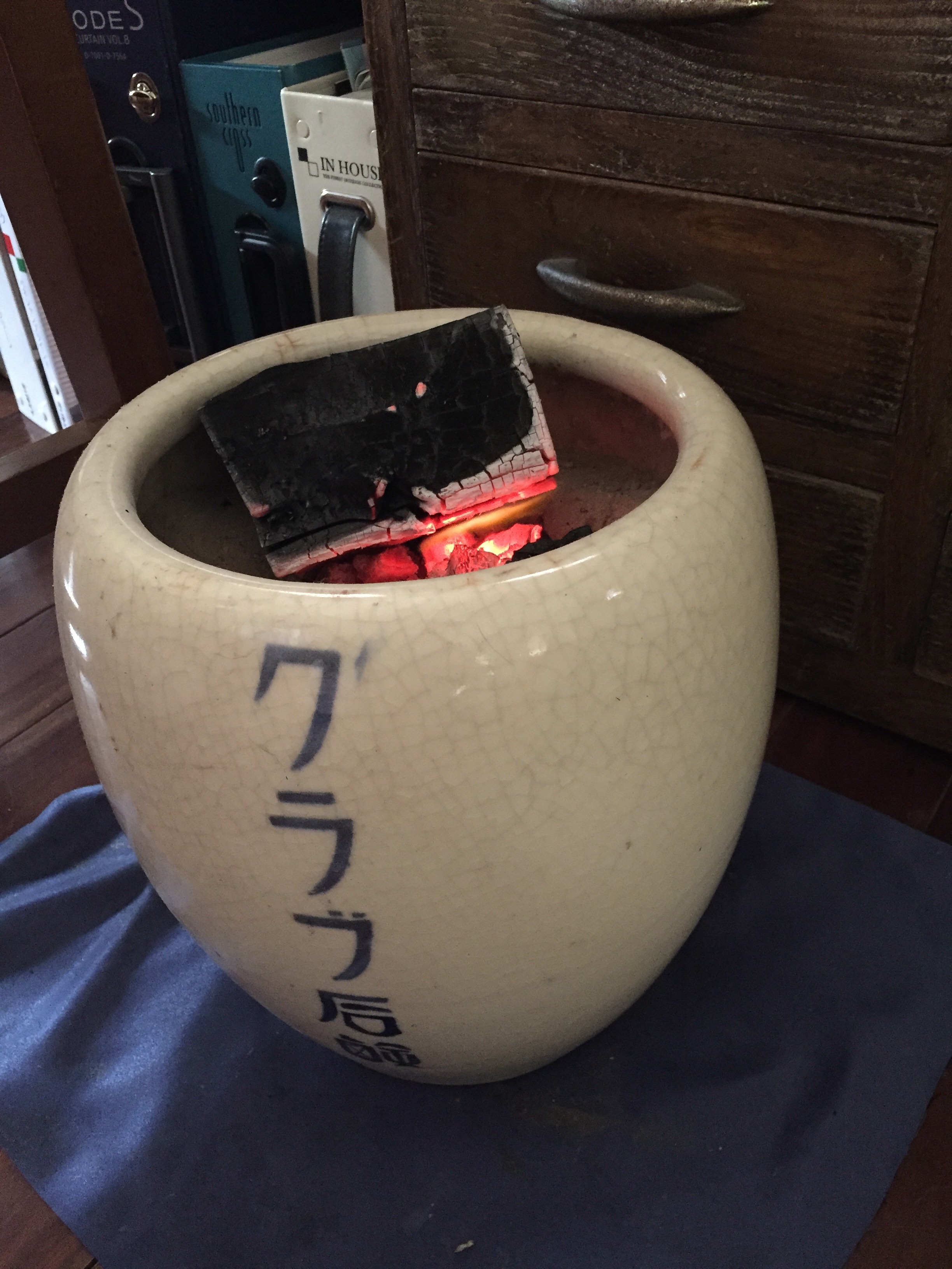 足元が寒い!って事で火鉢の出番。薪ストーブに火が入っているので、BBQの残りの木炭を薪ストーブの中にポイっと入れて火をつけて、火鉢に移すだけ。