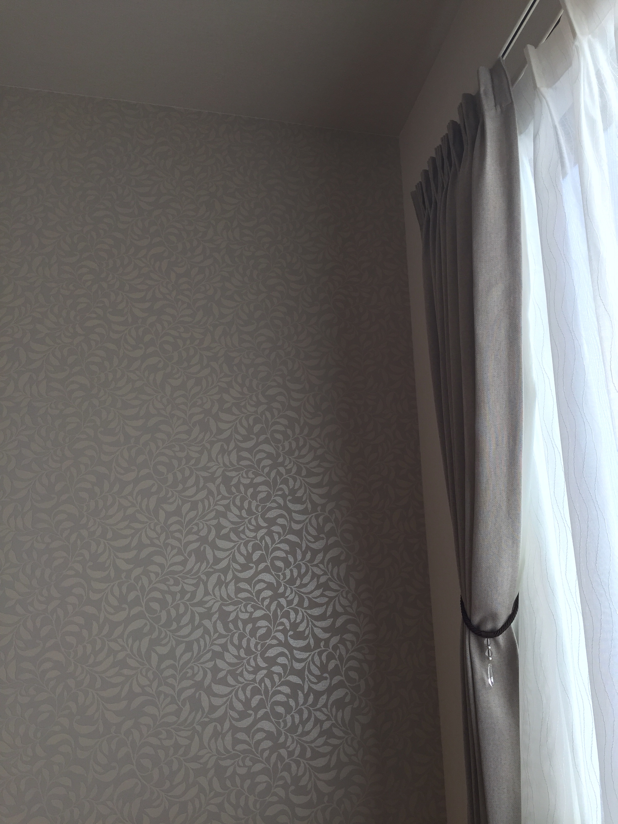 壁は一面だけアクセントに、天井のグレーのクロスの色になじむようなカーテン。