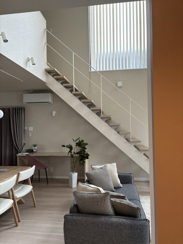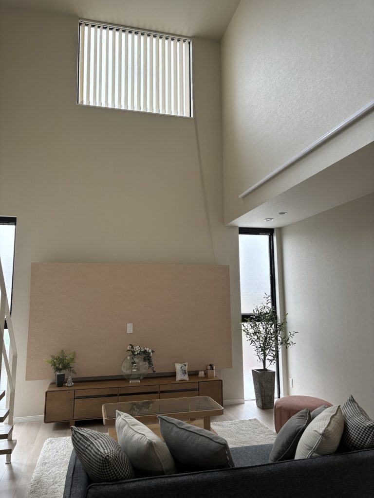 リビングのカーテンは赤みのあるグレーの建具に合わせています。
