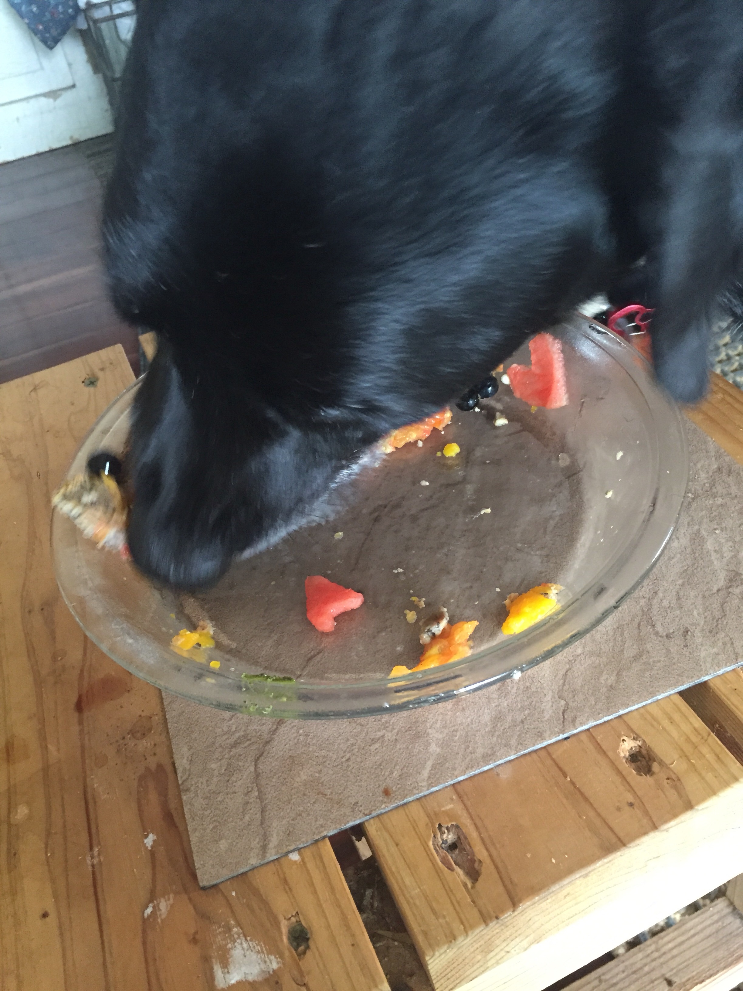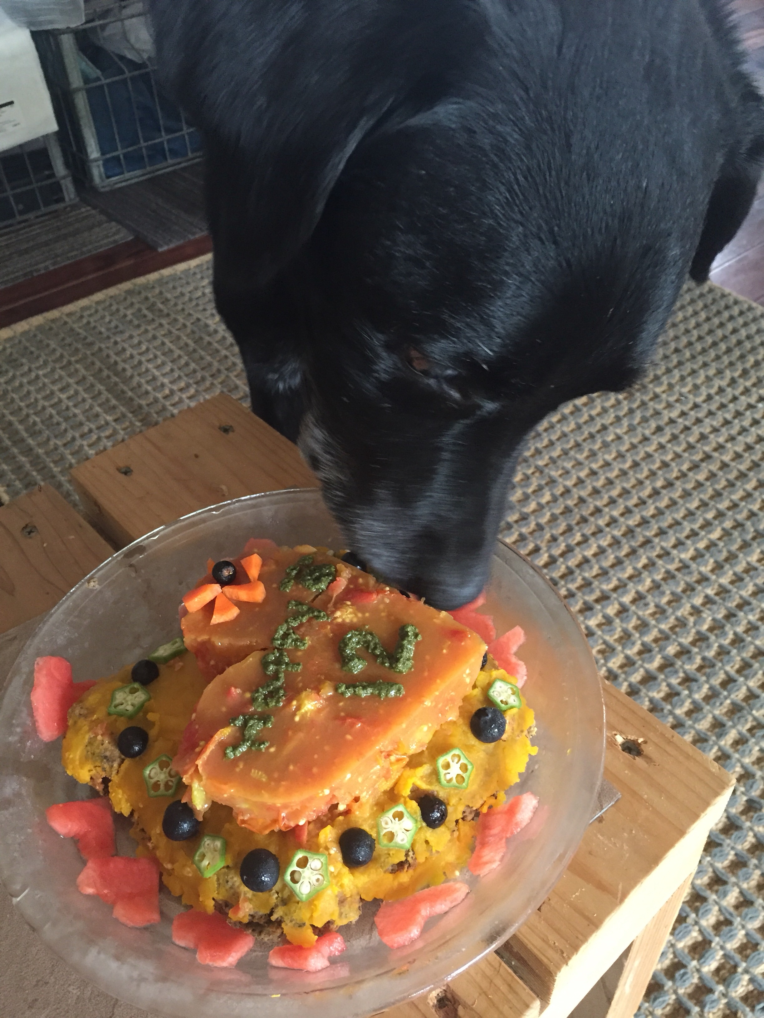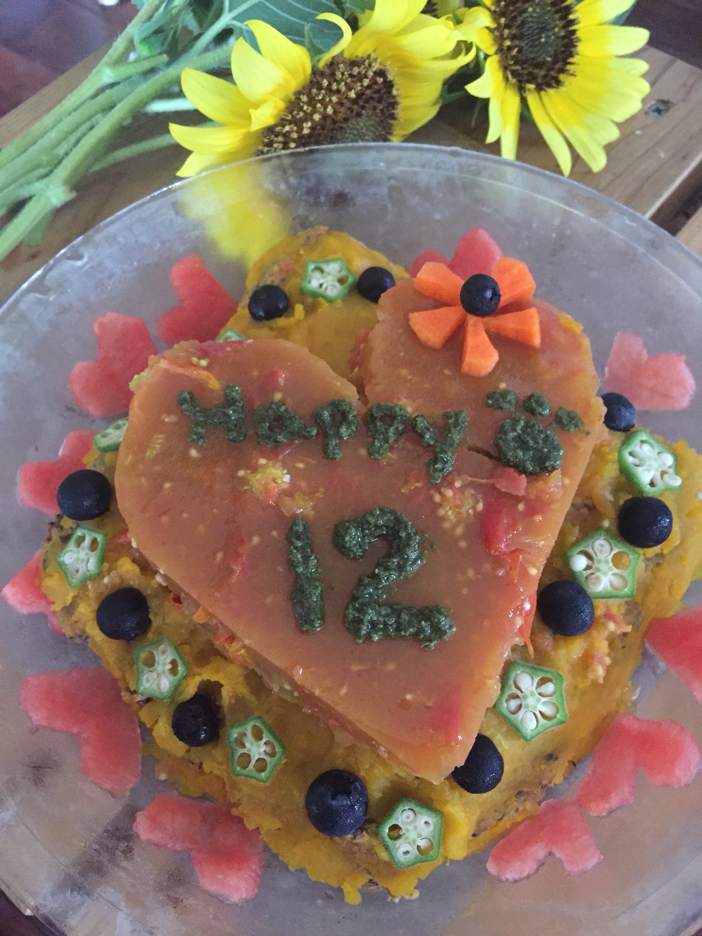 おからケーキを焼いて、カボチャペーストを塗って、自家製ミニトマトの寒天の上に 実家製バジルソースで 字を書きました。