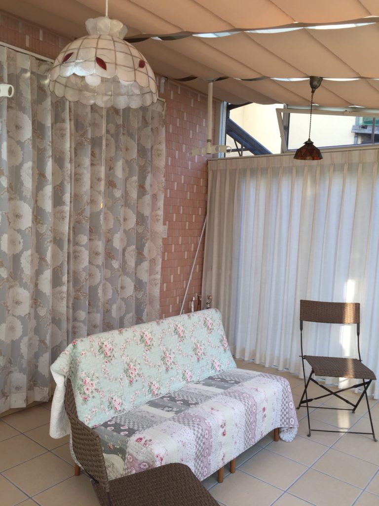 淡いサーモンピンクのストライプの壁に同系のサーモンピンクの天井。