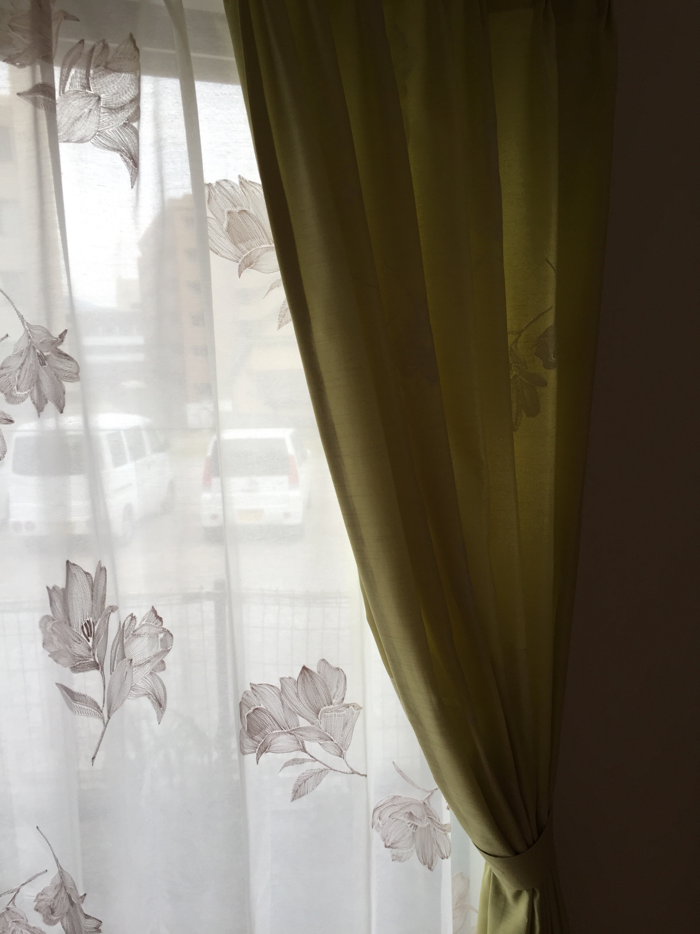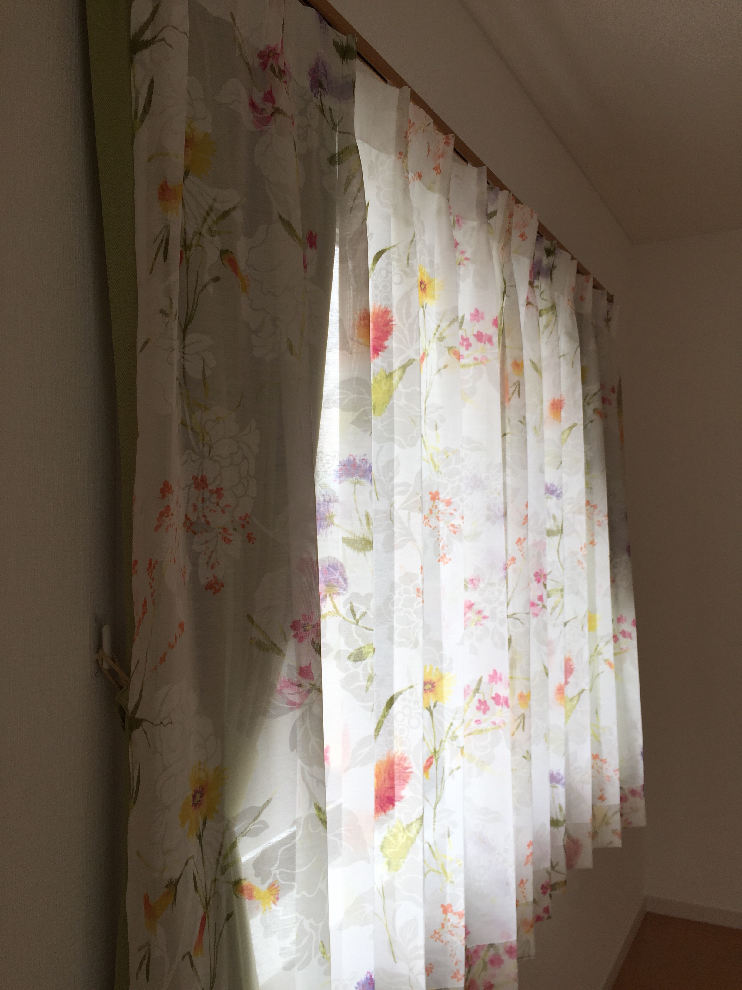 リビングはおとなしめ、白の刺繍のレースになりました。