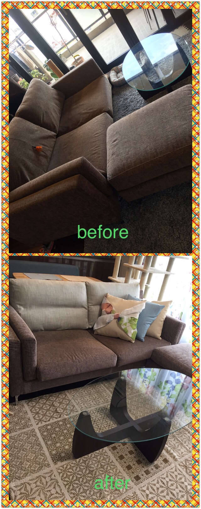 こちらは ソファーの背クッションのカバーを作り変えましたっていう写真です。