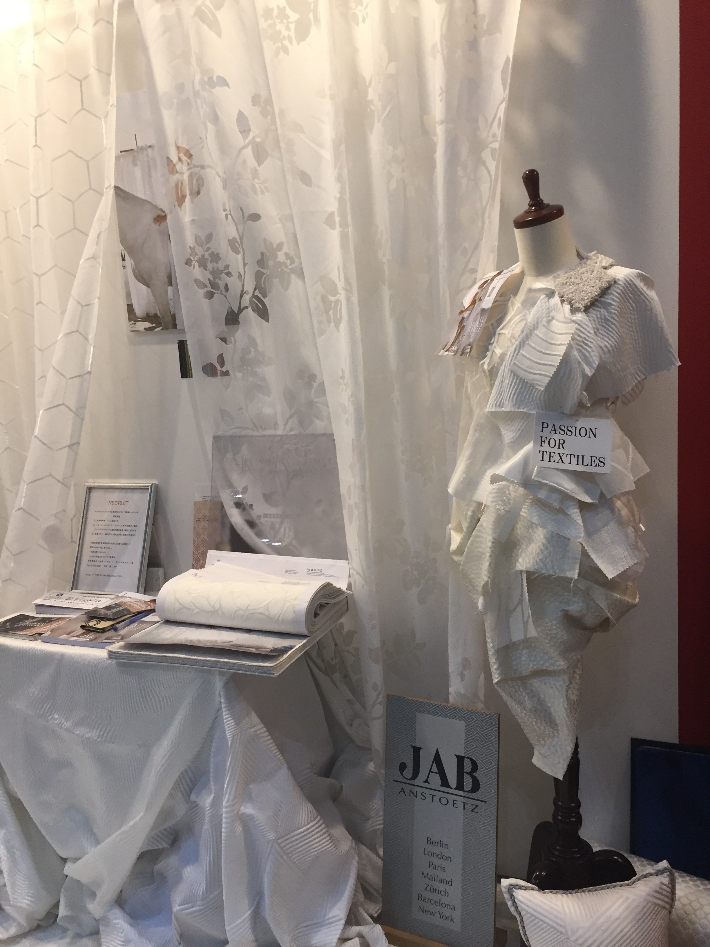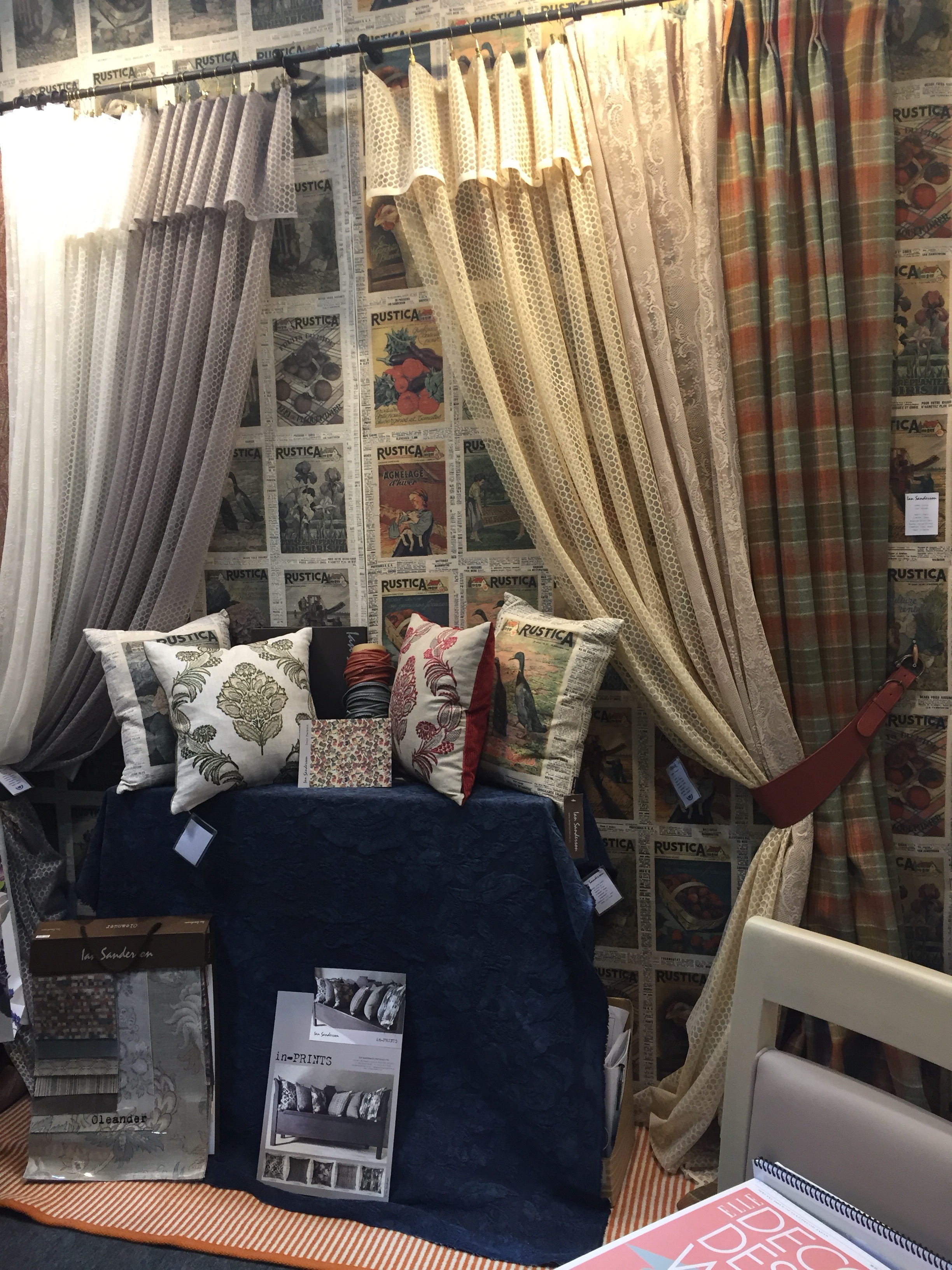 今回一番気になったブース。引き寄せられたらやっぱり素材がウールやコットンでした。壁に貼ってあるのもカーテン生地。カーテンの丈、床から1㎝とか2㎝とかあげて作るのが一般的なっているのですが、やっぱりこんな風に床に垂らしてあげるのが素敵だなぁと思う…