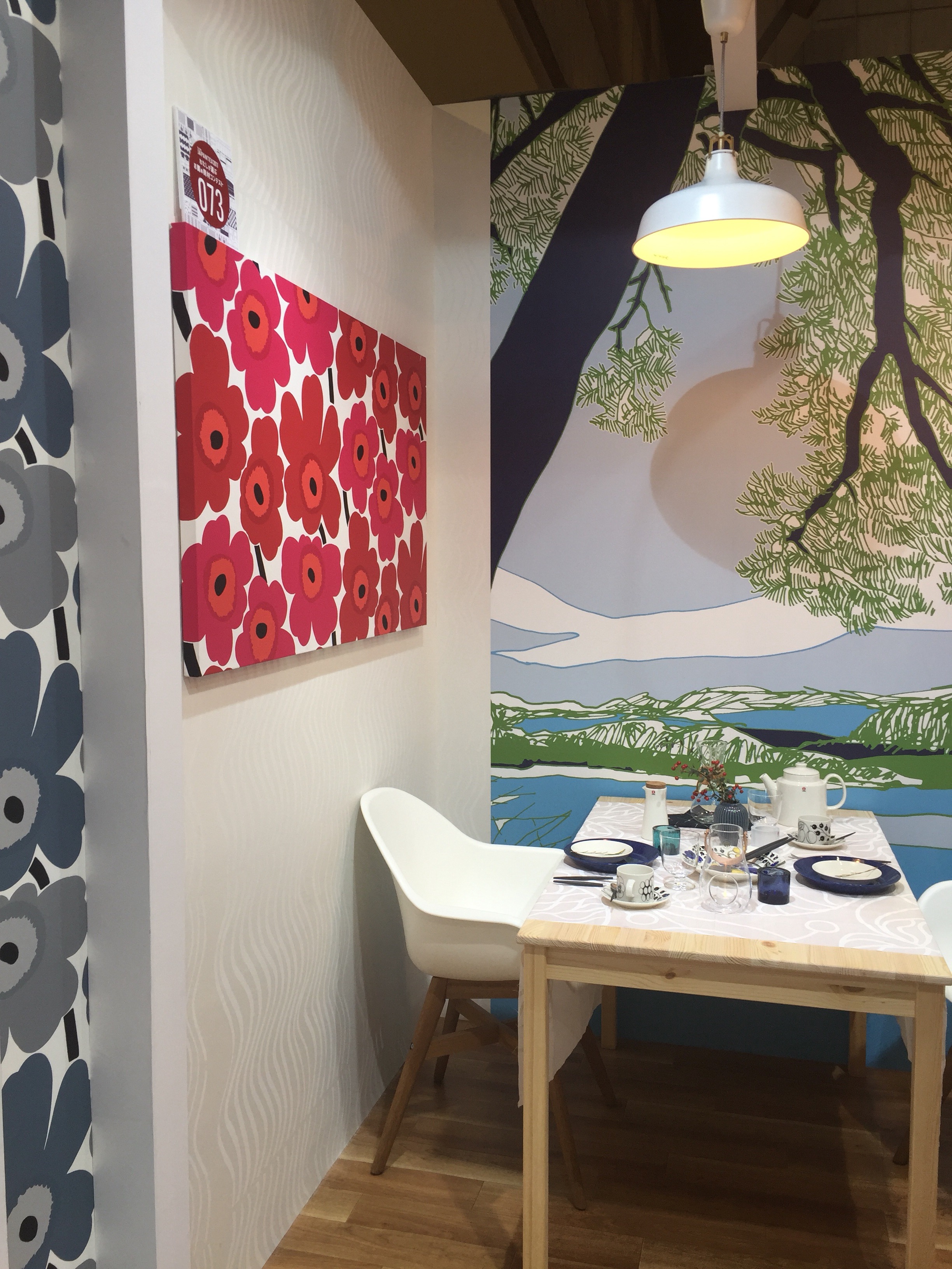 ホワイト一色で飾られたブース。斬新な衣装を身にまとったトルソー。マリメッコがかわいくて なぜか今年は動物柄に目が行きます。犬じゃないのに…