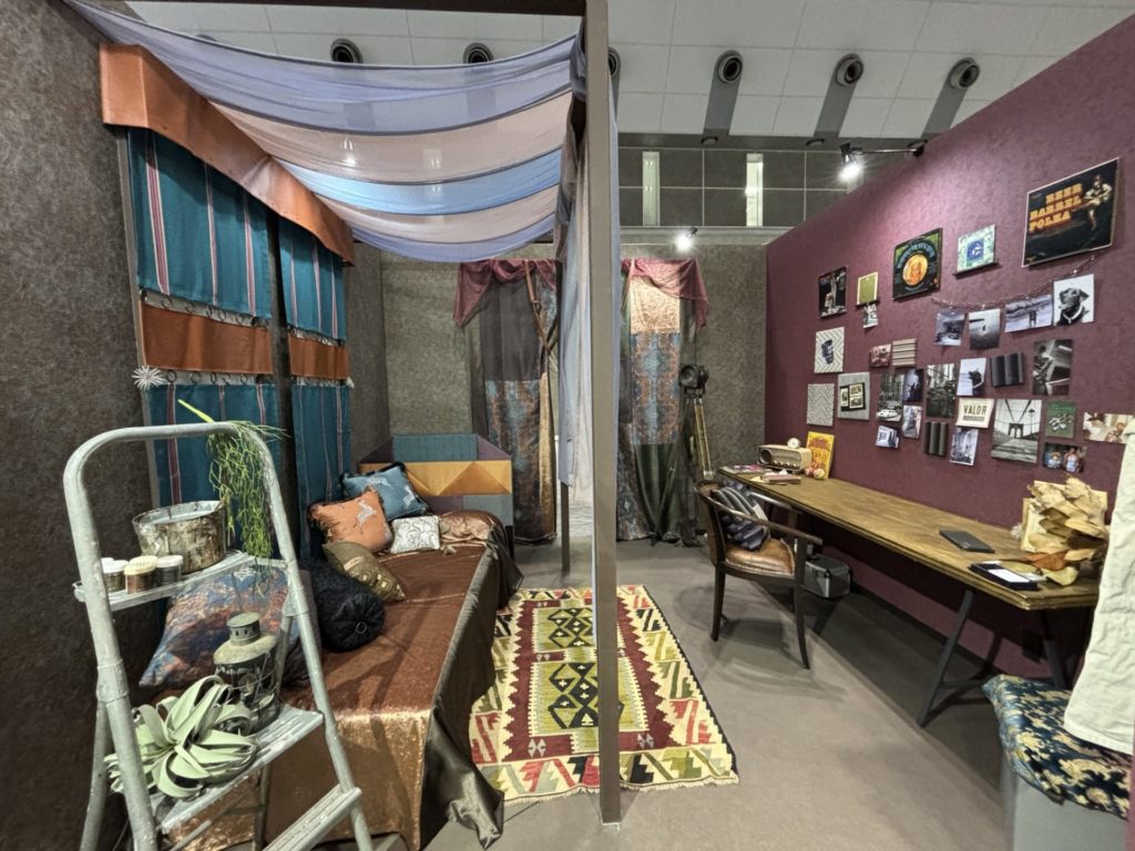 舞台で使われた布の端切れをつなぎ合わせたパッチワークカーテンは、リボーンファブリックで作成しました。
