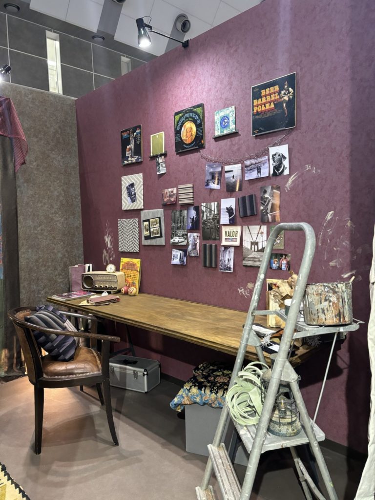 三脚ライトやアンティークの木箱、ペイント用のバケツとペンキで汚した壁など、