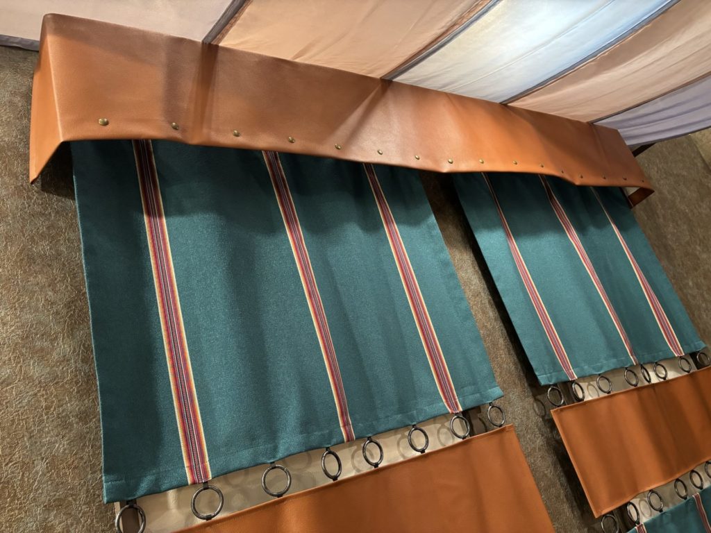 カーテン生地と椅子生地(合皮)をリングランナーでつなぎあわせるという無茶ぶり。