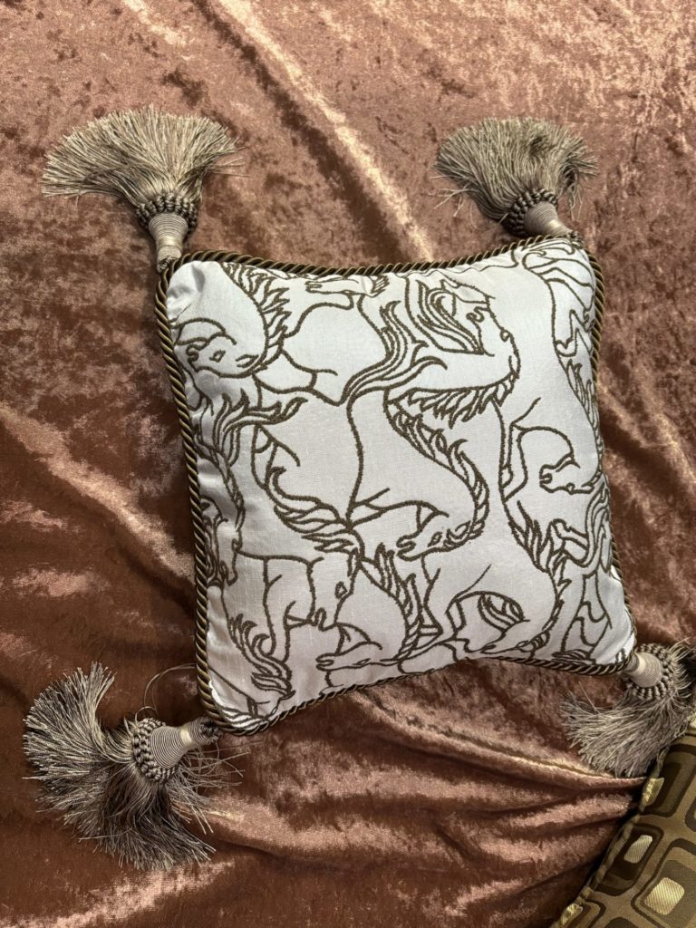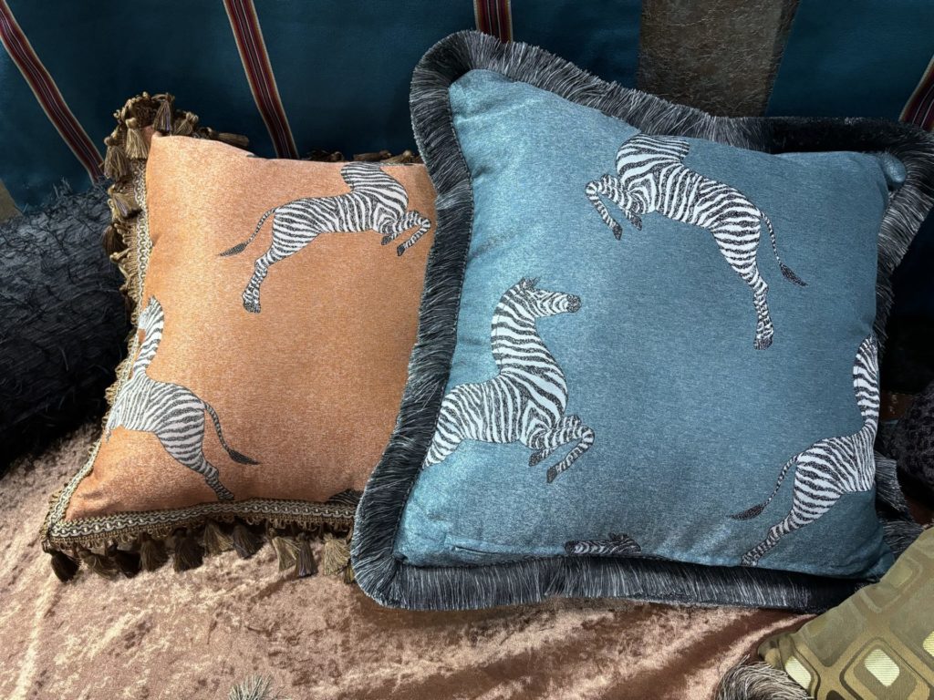 クッションにアニマルプリントを取り入れて、たてがみやしっぽに見立てたフリンジを使ったり、
