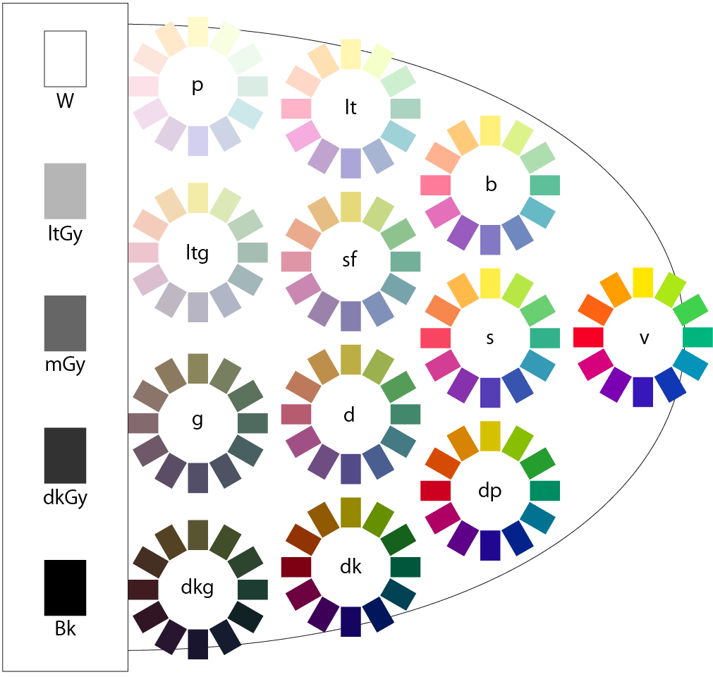 低明度・中彩度(dp・dk)のトーンでまとめることで、派手になりがちな多色使いを落ち着いた雰囲気に。