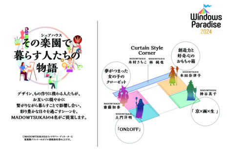今回の展示では、「シェアハウスに住むアーティスティックな仕事のプロをめざす住民たち」というテーマで、窓装飾を中心に空間をコーディネートしました。